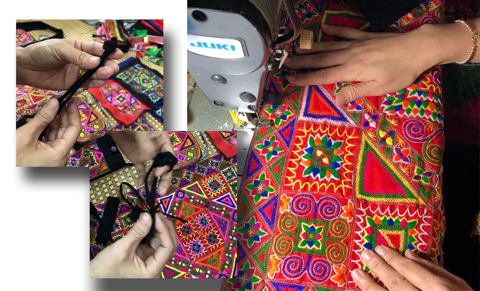 May ghép túi sau khi hoàn thiện phần thêu. Cúc được thắt từ chính những phần vải thừa.