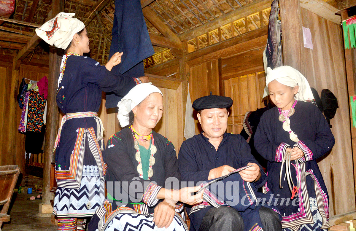 Người Dao tiền thôn Khuổi Xoan, xã Hồng Quang trao đổi về kỹ thuật thêu hoa văn trên thổ cẩm của dân tộc mình.