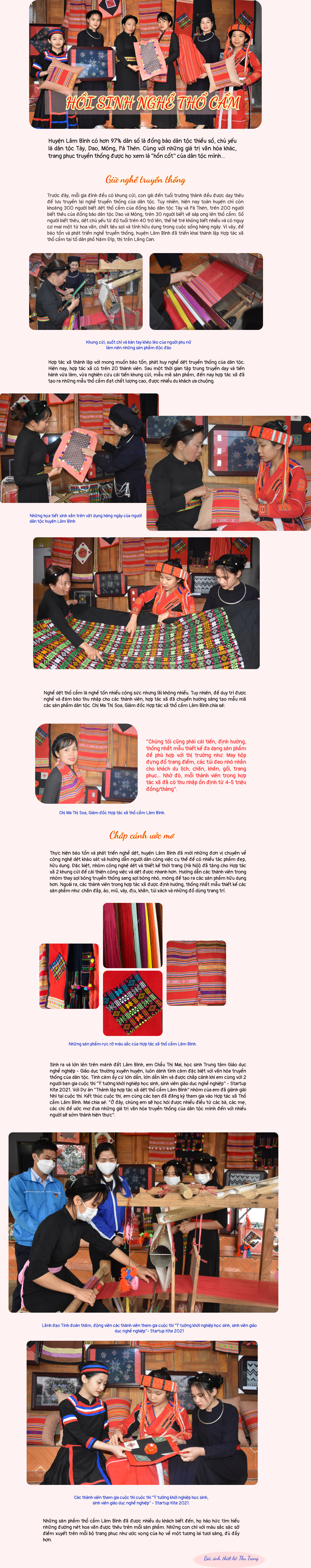 Hồi sinh nghề thổ cẩm Ngày đăng: Thứ 5, 3/3/2022 - 8:21 Lượt xem: 796 Huyện lâm Bình có hơn 97% dân số là đồng bào dân tộc thiểu số chủ yếu là dân tộc Tày, Dao, Mông, Pà Thẻn. Cùng với giá trị văn hóa khác, trang phục truyền thống được họ xem là "hồn cốt" của dân tộc mình... Theo: baotuyenquang.com.vn./. Bài viết liên quan Ngày xuân khám phá trang phục của phụ nữ Dao Tiền Thứ 5, 24/2/2022 - 22:51 Du lịch cộng đồng góp phần gìn giữ trang phục truyền thống Thứ 3, 22/2/2022 - 11:9 Gửi hồn quê qua chiếc nón Tày Thứ 4, 5/1/2022 - 9:20