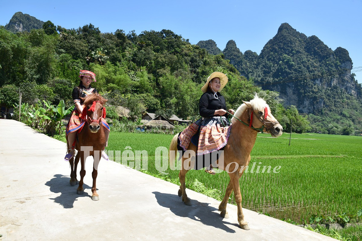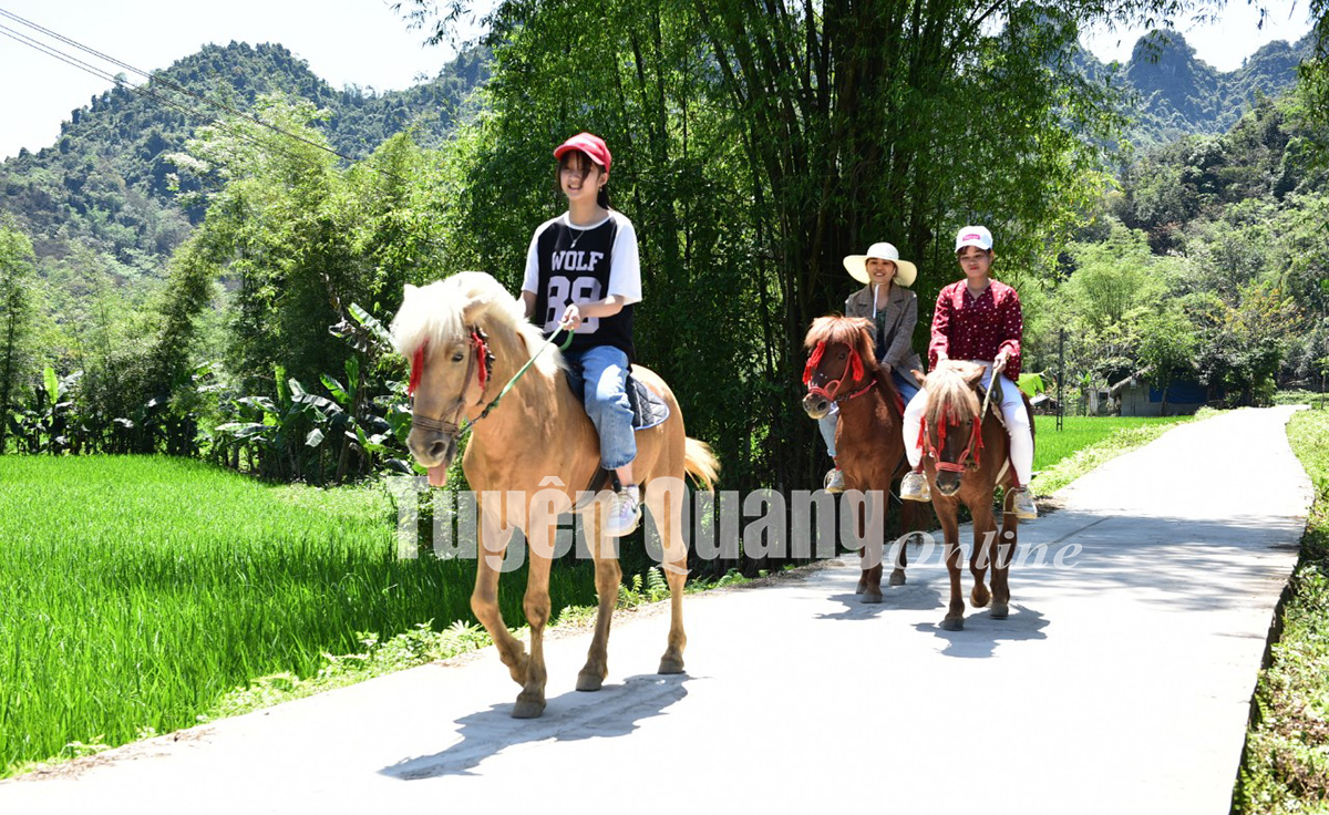 Du khách cưỡi ngựa ngắm cảnh cánh đồng, quần thể nhà sàn của đồng bào Tày Khuôn Hà.