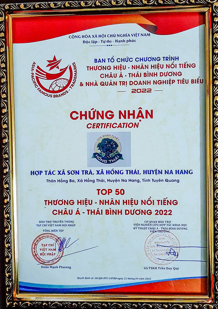 Ngày 24/4/2022, tại Hà Nội, Viện Nghiên cứu hợp tác khoa học kỹ thuật châu Á - Thái Bình Dương phối hợp Tạp chí Việt Nam hội nhập tổ chức chương trình vinh danh “Thương hiệu - nhãn hiệu nổi tiếng châu Á - Thái Bình Dương và nhà quản trị doanh nghiệp tiêu biểu” năm 2022. Tại Lễ vinh danh, sản phẩm chè Shan tuyết Hồng Thái của Hợp tác xã Sơn Trà, xã Hồng Thái (Na Hang)- thành viên Hiệp hội DN tỉnh Tuyên Quang- đã lọt vào top 50 thương hiệu, nhãn hiệu nổi tiếng châu Á - Thái Bình Dương.