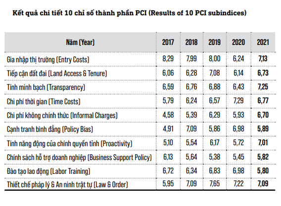 Trong 10 chỉ số thành phần PCI của tỉnh có đến 6 chỉ số tăng điểm so với năm 2021, gồm: Chỉ số gia nhập thị trường tăng gần 1 điểm; tiếp cận đất đai, tăng 0,6 điểm; tính minh bạch, tăng gần 1 điểm; chi phí không chính thức, tăng gần 2 điểm; tính năng động của chính quyền tỉnh, tăng 1,3 điểm... Đây thực sự là nỗ lực rất lớn của tỉnh trong việc nâng cao năng lực chỉ số cạnh tranh đặc biệt trong bối cảnh dịch bệnh COVID-19 tác động xấu, ảnh hưởng nặng nề đến mọi mặt của đời sống kinh tế - xã hội.