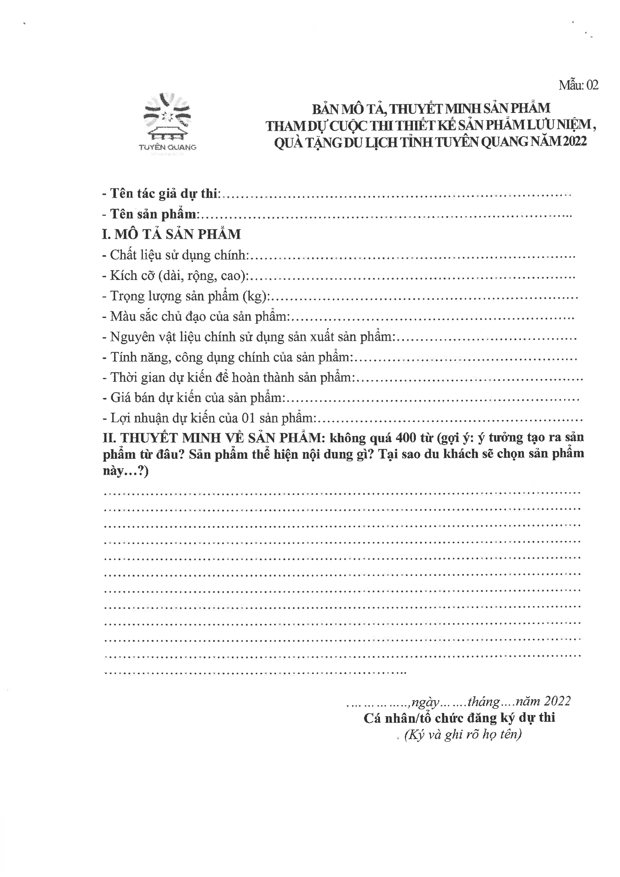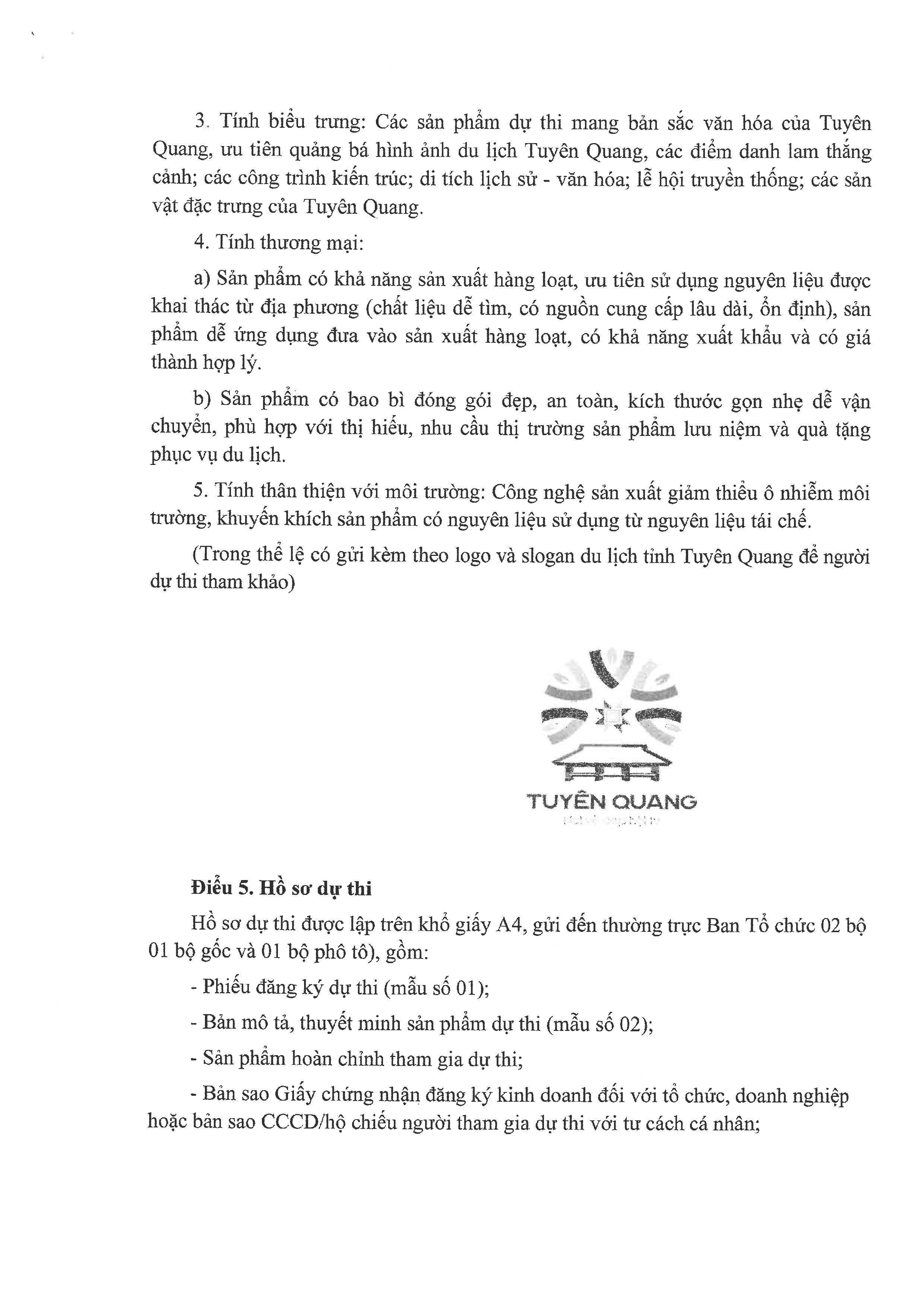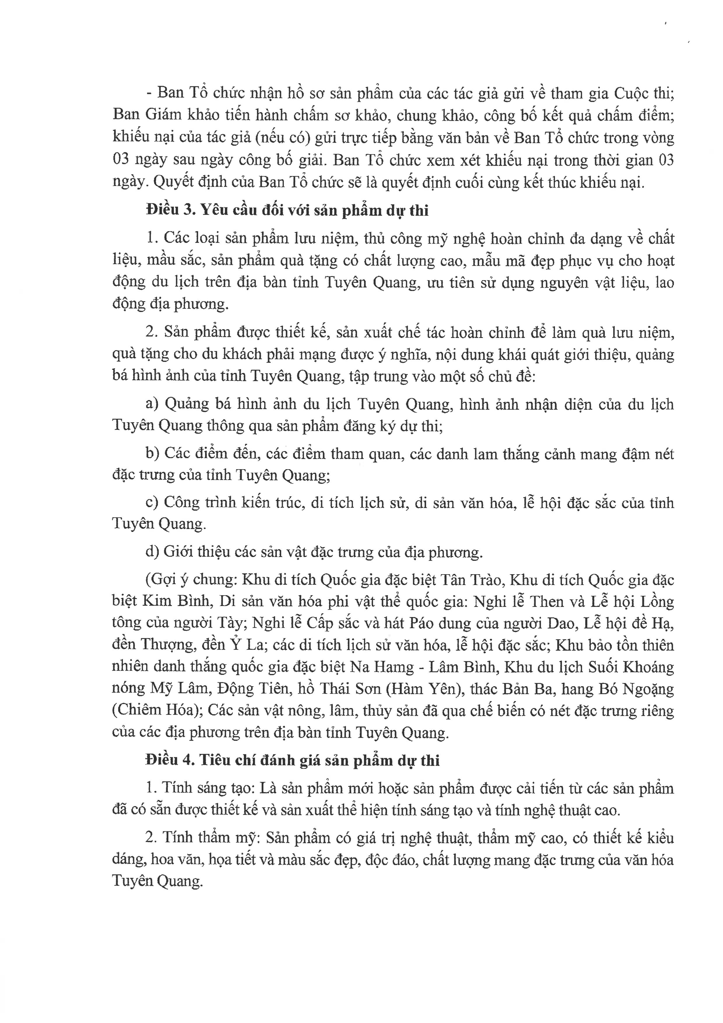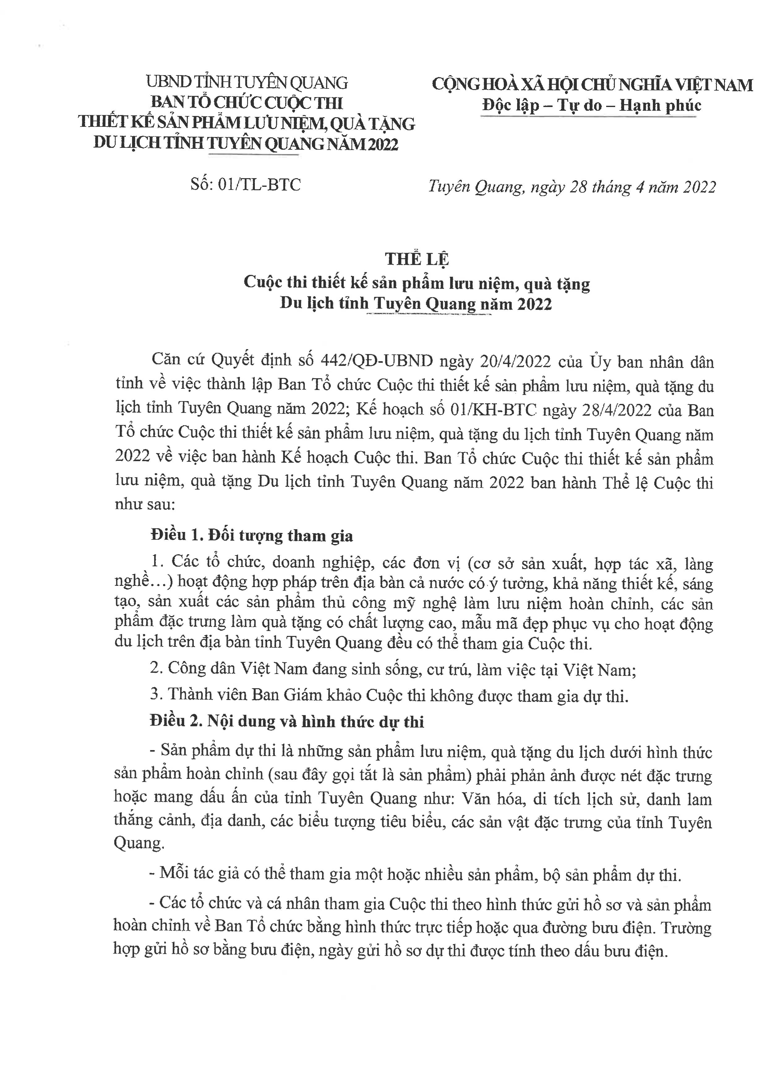 Thể lệ Cuộc thi thiết kế sản phẩm lưu niệm, quà tặng Du lịch tỉnh Tuyên Quang năm 2022 Ngày đăng: Thứ 2, 9/5/2022 - 23:16 Lượt xem: 863 Ban Tổ chức Cuộc thi thiết kế sản phẩm lưu niệm, quà tặng Du lịch tỉnh Tuyên Quang năm 2022 ban hành Thể lệ số 01/TL-BTC ngày 28/4/2022 về Cuộc thi thiết kế sản phẩm lưu niệm, quà tặng Du lịch tỉnh Tuyên Quang năm 2022 Bài viết liên quan Kế hoạch tổ chức Cuộc thi thiết kế sản phẩm lưu niệm, quà tặng Du lịch tỉnh Tuyên Quang năm 2022 Thứ 2, 9/5/2022 - 23:6 Lễ hội Khinh khí cầu quốc tế - mở màn tốt đẹp mùa du lịch Thứ 4, 4/5/2022 - 23:11 Kế hoạch phòng chống covid tại Hội chợ Thương mại - Du lịch tỉnh Tuyên Quang năm 2021 Thứ 5, 2/12/2021 - 15:49