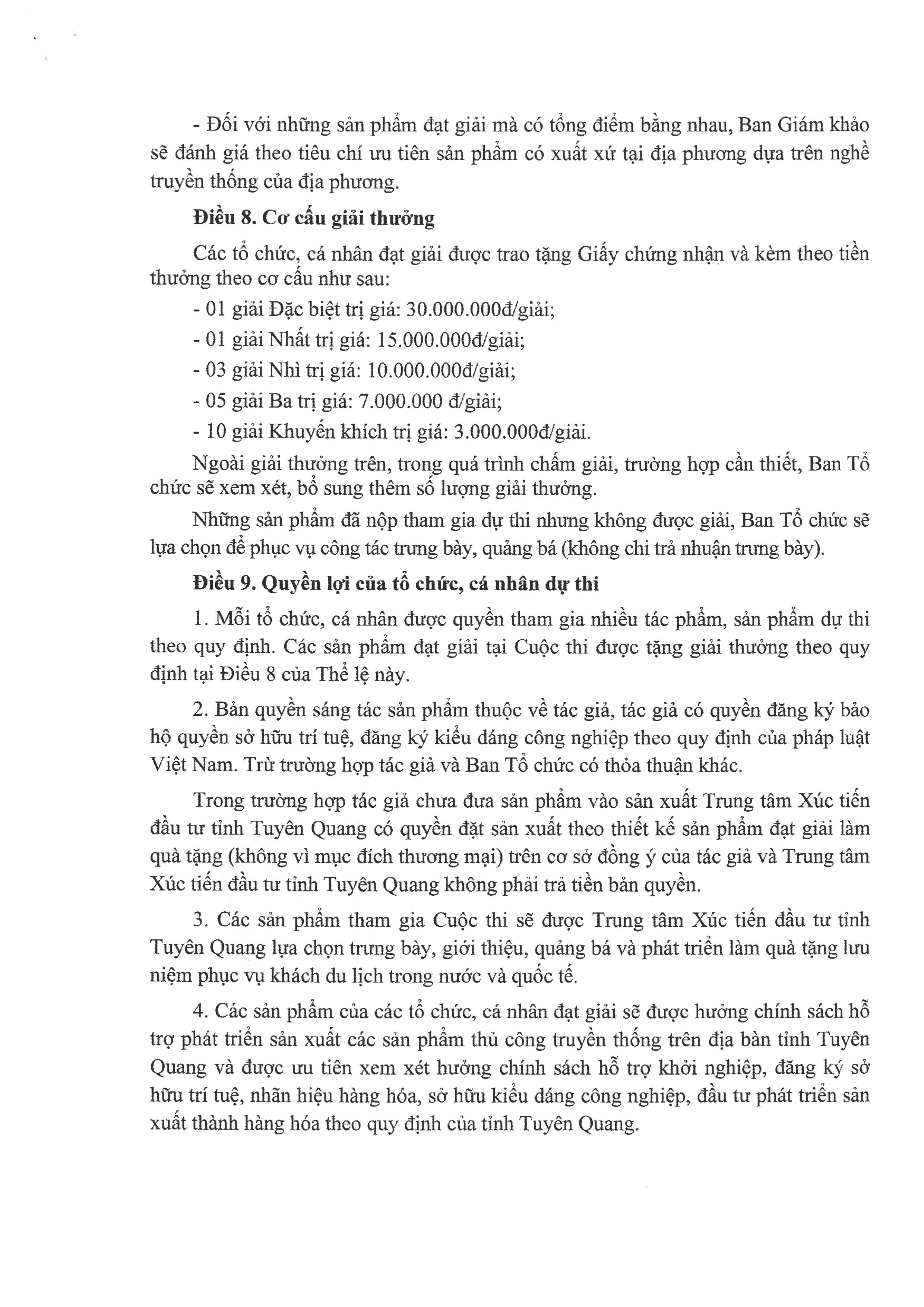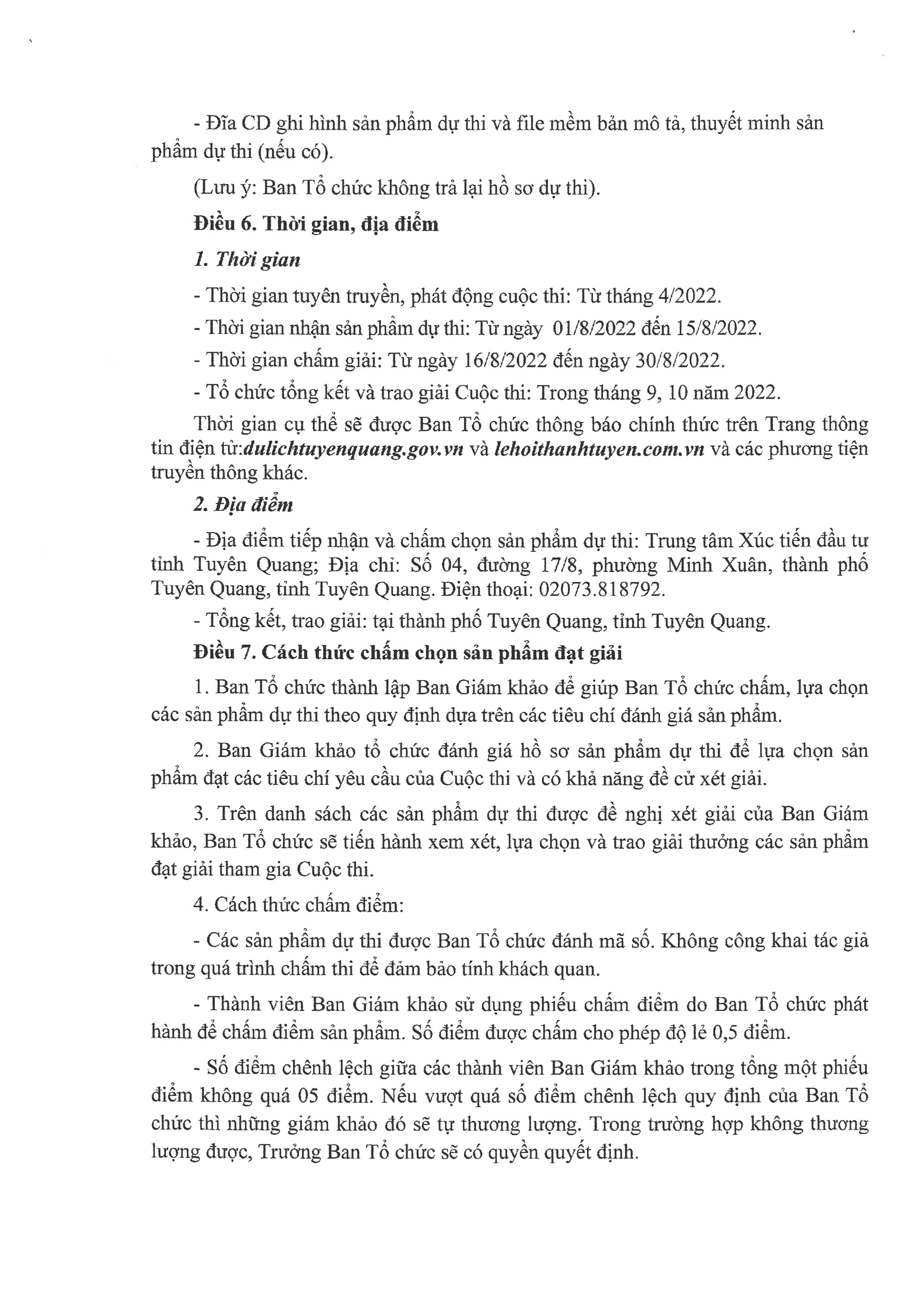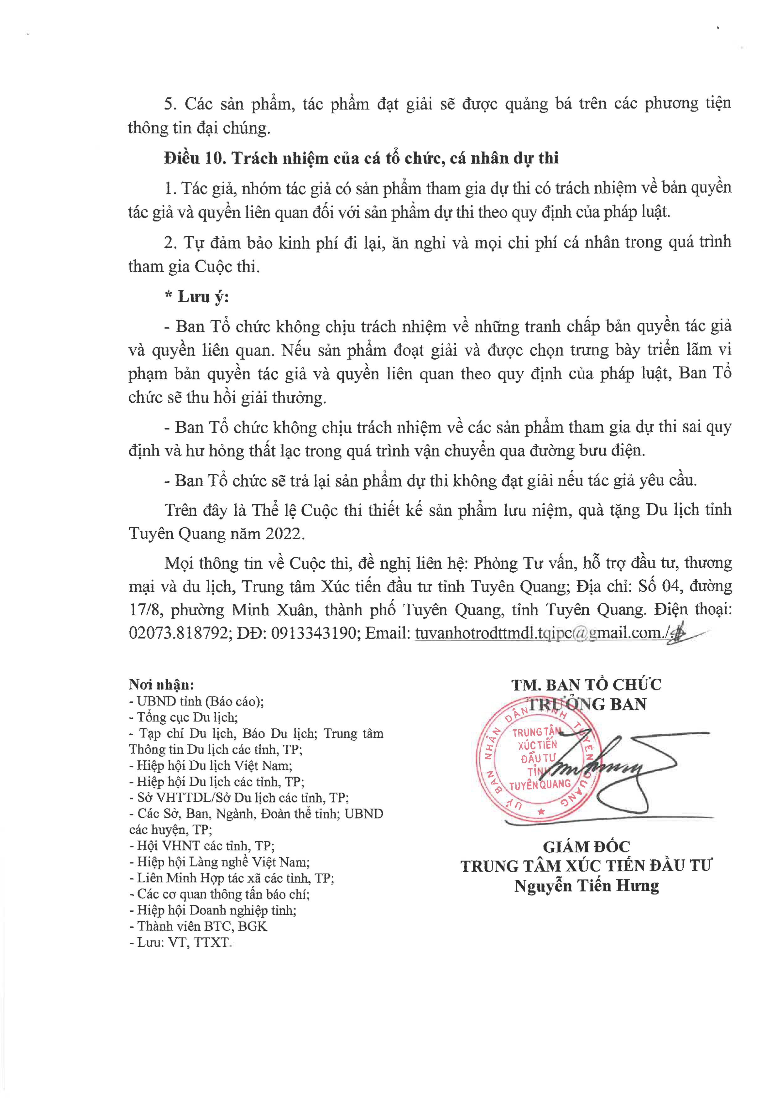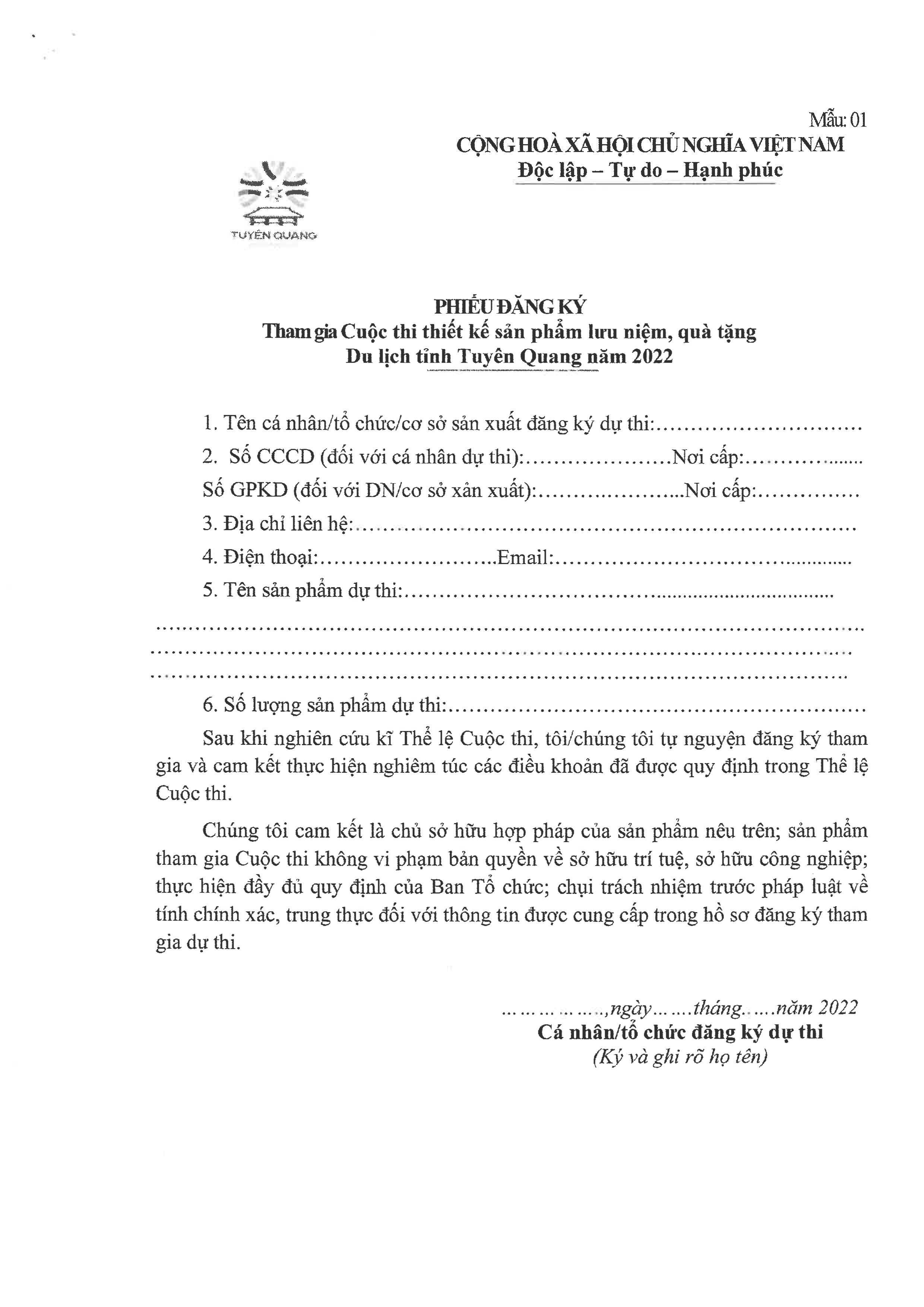 Thể lệ Cuộc thi thiết kế sản phẩm lưu niệm, quà tặng Du lịch tỉnh Tuyên Quang năm 2022 Ngày đăng: Thứ 2, 9/5/2022 - 23:16 Lượt xem: 863 Ban Tổ chức Cuộc thi thiết kế sản phẩm lưu niệm, quà tặng Du lịch tỉnh Tuyên Quang năm 2022 ban hành Thể lệ số 01/TL-BTC ngày 28/4/2022 về Cuộc thi thiết kế sản phẩm lưu niệm, quà tặng Du lịch tỉnh Tuyên Quang năm 2022 Bài viết liên quan Kế hoạch tổ chức Cuộc thi thiết kế sản phẩm lưu niệm, quà tặng Du lịch tỉnh Tuyên Quang năm 2022 Thứ 2, 9/5/2022 - 23:6 Lễ hội Khinh khí cầu quốc tế - mở màn tốt đẹp mùa du lịch Thứ 4, 4/5/2022 - 23:11 Kế hoạch phòng chống covid tại Hội chợ Thương mại - Du lịch tỉnh Tuyên Quang năm 2021 Thứ 5, 2/12/2021 - 15:49