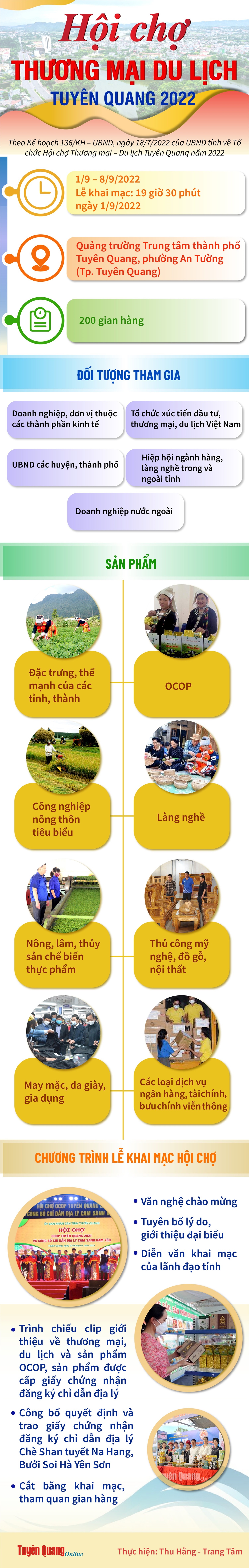 Hội chợ Thương mại - Du lịch Tuyên Quang năm 2022 Ngày đăng: Thứ 2, 22/8/2022 - 8:18 Lượt xem: 371 Hội chợ Thương mại - Du lịch Tuyên Quang năm 2022 Theo baotuyenquang.com.vn Bài viết liên quan Tổ chức Hội chợ Thương mại - Du lịch năm 2022 Thứ 5, 21/7/2022 - 10:3 Khơi dậy niềm tự hào truyền thống quê hương cách mạng Thứ 3, 12/7/2022 - 7:44 Hội nghị đối thoại, gặp gỡ doanh nghiệp quý 2 và đề xuất giải pháp nâng cao Chỉ số năng lực cạnh... Thứ 2, 27/6/2022 - 7:28