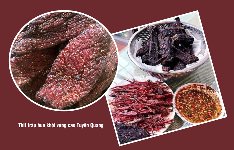Trâu hun khói hay còn được gọi là trâu gác bếp, thịt trâu khô. Món ăn này được chế biến từ thăn và bắp trâu tươi, trải qua quá trình gác bếp phức tạp bằng củi. Thịt trâu được chọn lọc kỹ sau đó được tẩm ướp bằng các gia vị như: Gừng, ớt, mắc khén rồi trải qua quá trình gác nghi ngút khói bếp để mang lại những miếng trâu cay cay kèm chút ngọt ngọt. Để cho ra món thịt trâu hun khói chuẩn vị thì việc lựa chọn thịt trâu là yếu tố quyết định độ ngon của món trâu hun khói. Người làm phải lựa chọn những miếng thịt tươi ngon nhất, phần thịt thăn nạc hoặc bắp trâu, tuyệt đối không chứa gân hoặc mỡ. Tiếp đó, thái theo thớ dọc thành từng miếng có chiều dài khoảng 20 cm và bề dày khoảng 5 cm, dần cho thịt mềm ra. Bước tiếp theo nướng ớt khô cho đến khi thơm rồi cho vào cối giã nhuyễn cùng với tỏi, gừng, sả, mắc khén, muối, đường rồi trộn đều thành hỗn hợp gia vị hơi sệt. Người làm đem hỗn hợp vừa làm chà sát lên thịt trâu, cho thêm một ít bột ngọt, đường, muối để ướp khoảng 3 tiếng cho thịt trâu ngấm đều gia vị. Cuối cùng là công đoạn sấy khô thịt trâu lên dàn tre. Than được đốt từ gỗ to để tạo khói đều. Khi sấy, đồng bào rải lá ngải xen lẫn thịt trâu vừa để giữ hương vị thơm ngon của thịt mà giúp thịt không bị khô.
