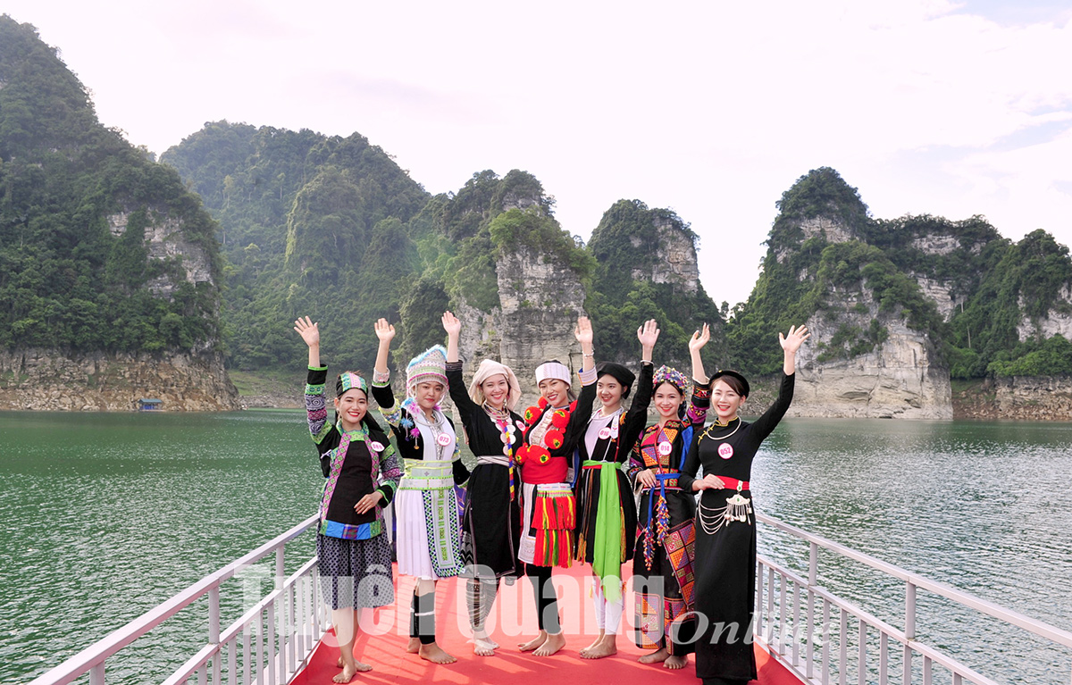 Các thí sinh Cuộc thi Người đẹp xứ Tuyên tham gia trải nghiệm tại hồ sinh thái Na Hang - Lâm Bình.