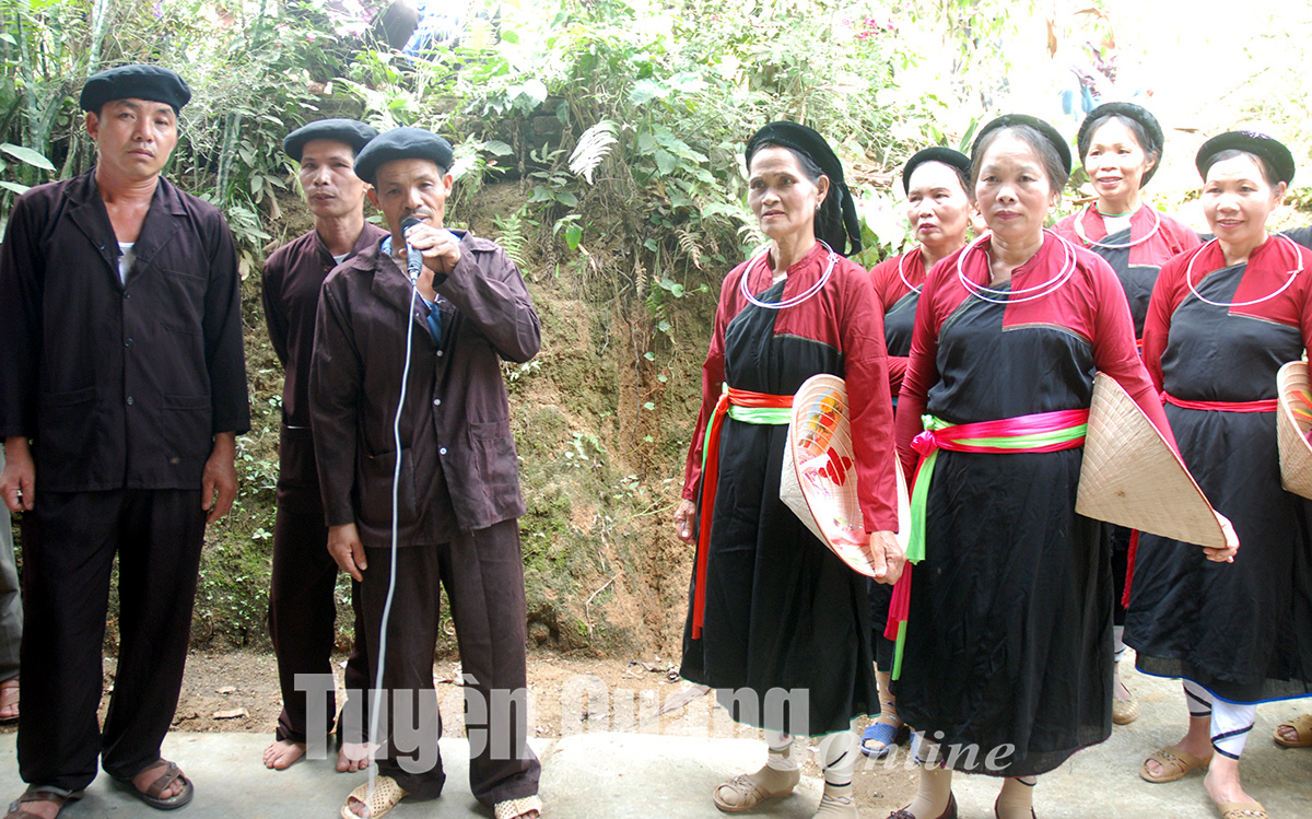 Đồng bào Cao Lan biểu diễn điệu múa giã cốm.