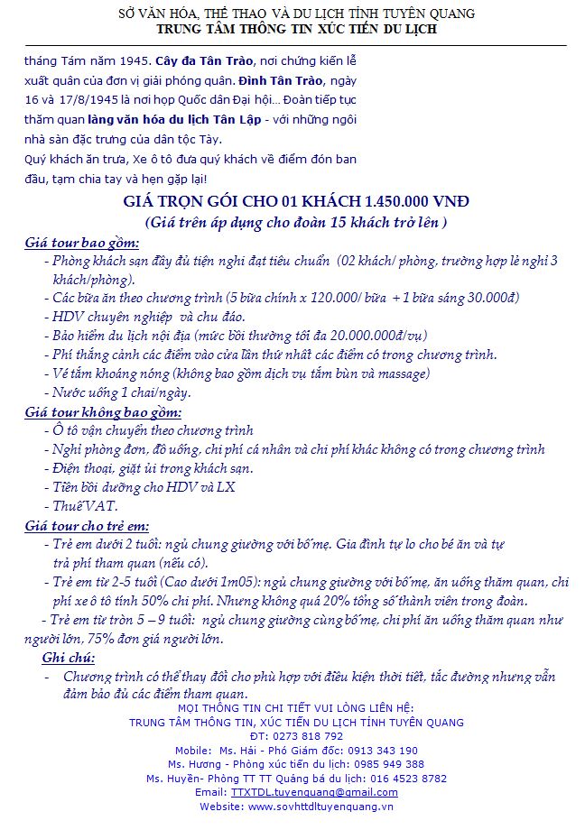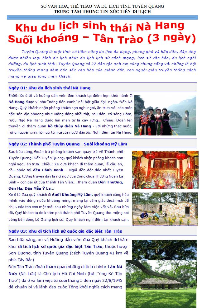 Khu du lịch sinh thái Nà Hang Suối khoáng – Tân Trào (3 ngày) Ngày đăng: Thứ 3, 13/1/2015 - 13:46 Lượt xem: 3305 Khu du lịch sinh thái Nà Hang Suối khoáng – Tân Trào (3 ngày) Bài viết liên quan