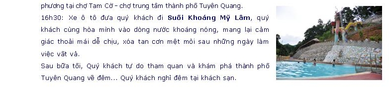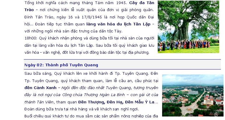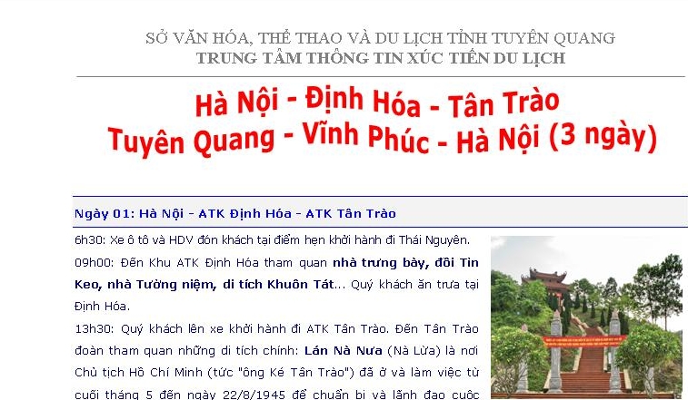 Định Hóa- Tuyên Quang - Tây Thiên (3 ngày) Ngày đăng: Thứ 6, 12/6/2015 - 8:54 Lượt xem: 3918 Định Hóa- Tuyên Quang - Tây Thiên (3 ngày) Bài viết liên quan Hà Nội - Tây Thiên - Hà Giang (3 ngày) Thứ 6, 12/6/2015 - 8:55 Tuyên Quang - Hà Giang- Thanh Thủy (02 ngày) Thứ 6, 12/6/2015 - 8:57 Lung linh đêm hội Thành Tuyên – Suối nước nóng Mỹ Lâm (2 ngày) Thứ 3, 13/1/2015 - 13:46