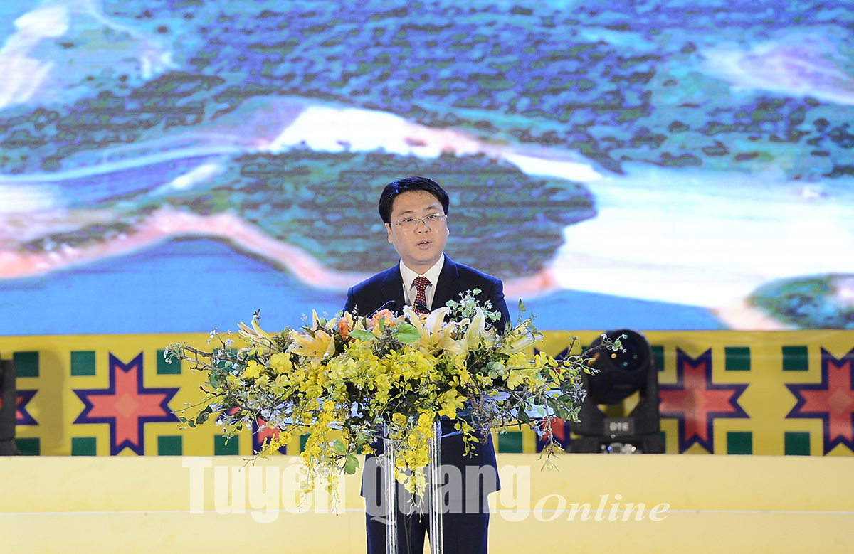 Phó Bí thư Huyện ủy, Chủ tịch UBND huyện Na Hang Tô Viết Hiệp phát biểu khai mạc lễ hội. Ảnh: Quang Hòa