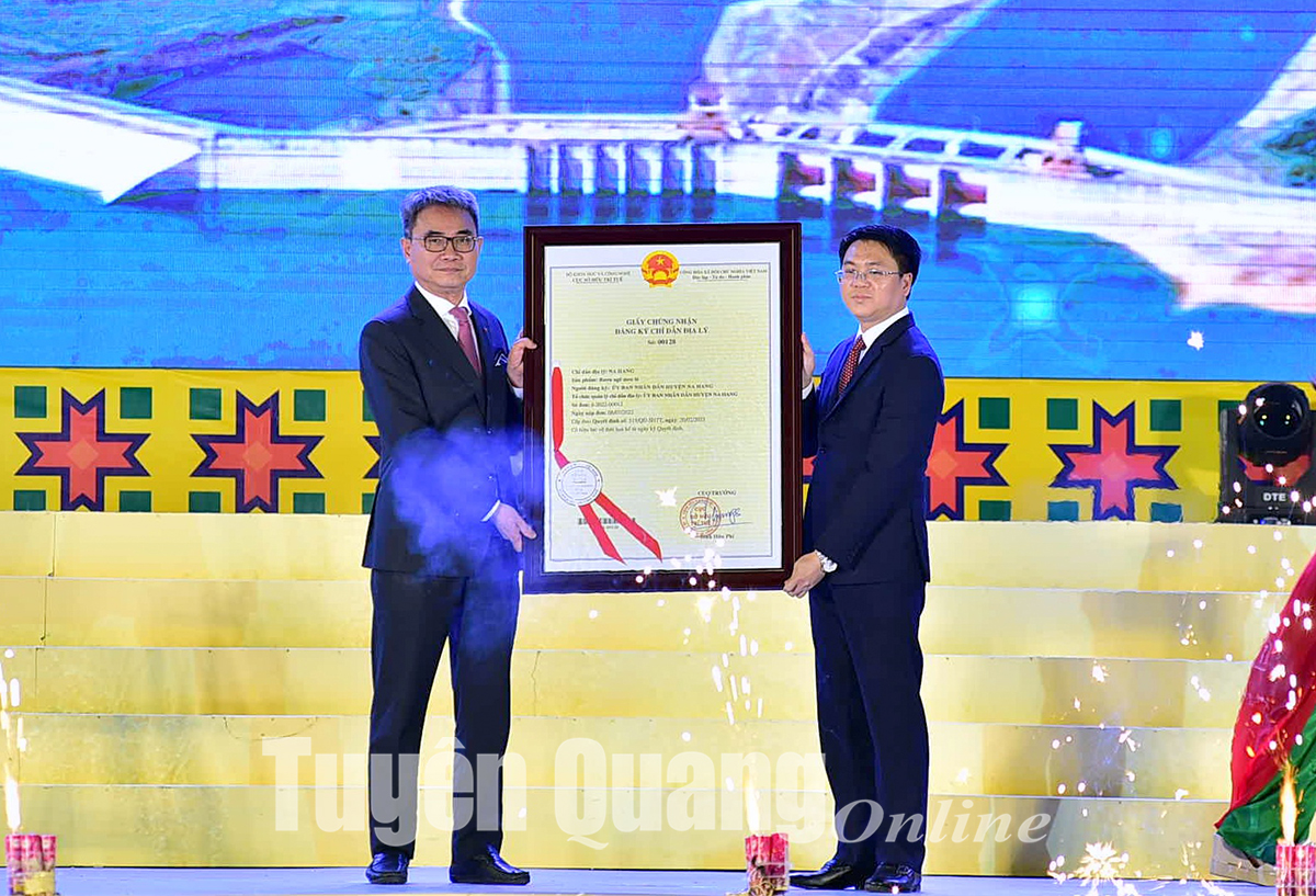 Lãnh đạo Cục Sở hữu trí tuệ trao chứng nhận Chỉ dẫn địa lý Rượu ngô men lá Na Hang cho huyện Na Hang.