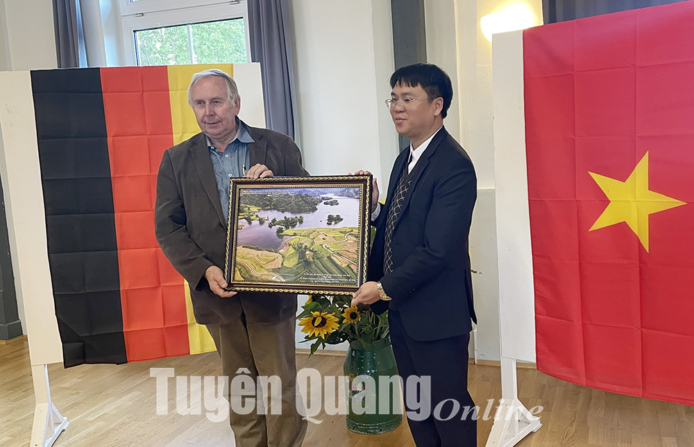 Chủ tịch UBND huyện Tô Viết Hiệp tặng Thị trưởng Lohmen Bern Dikau bức tranh phong cảnh Na Hang.