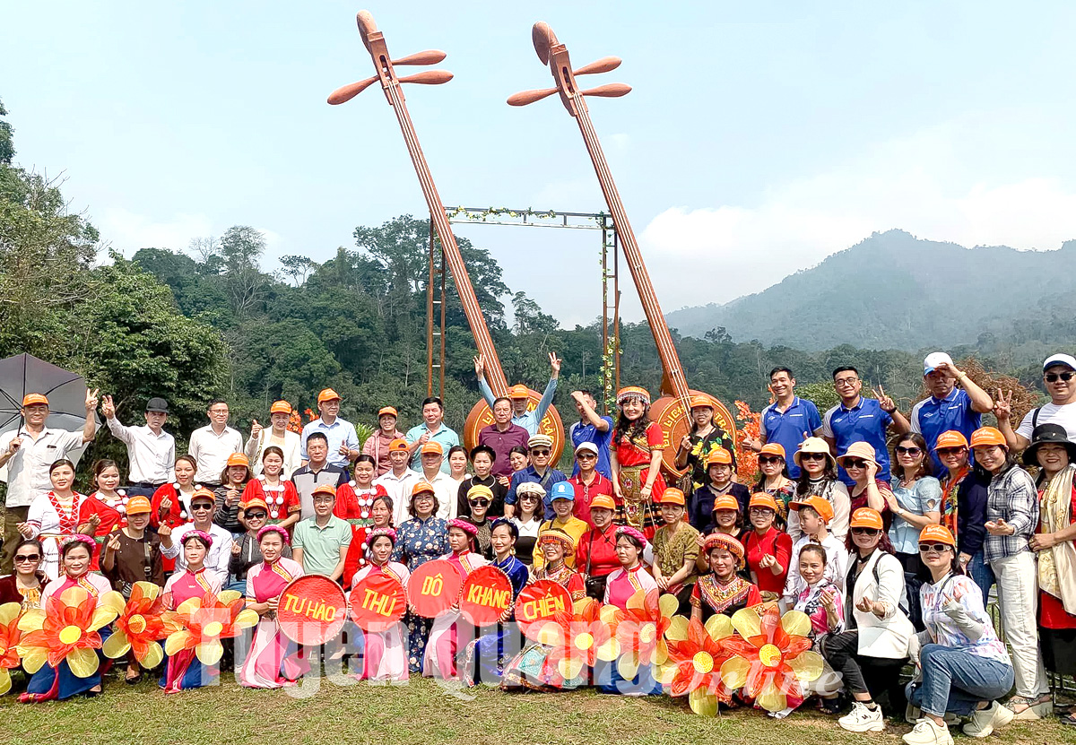Du khách về nguồn thích thú chụp ảnh check -in với 2 cây đàn Tính khổng lồ tại Tân Trào.