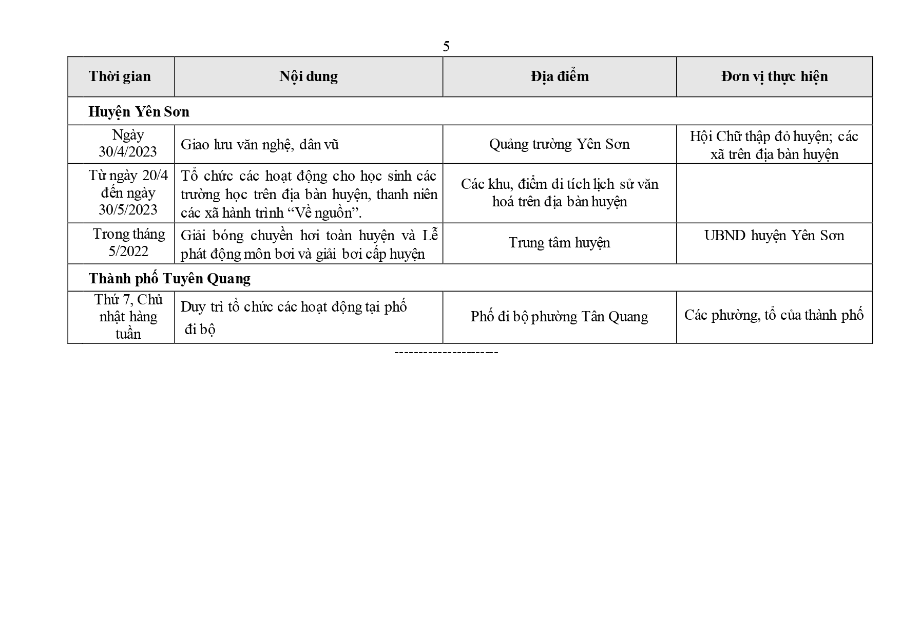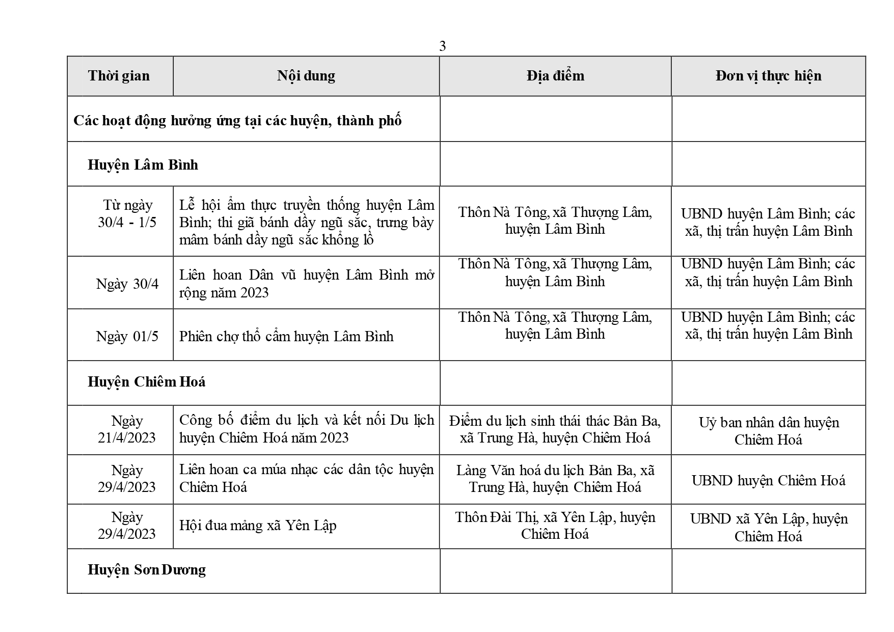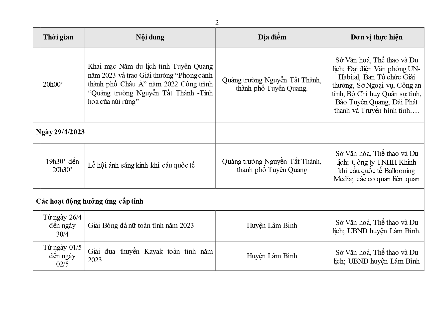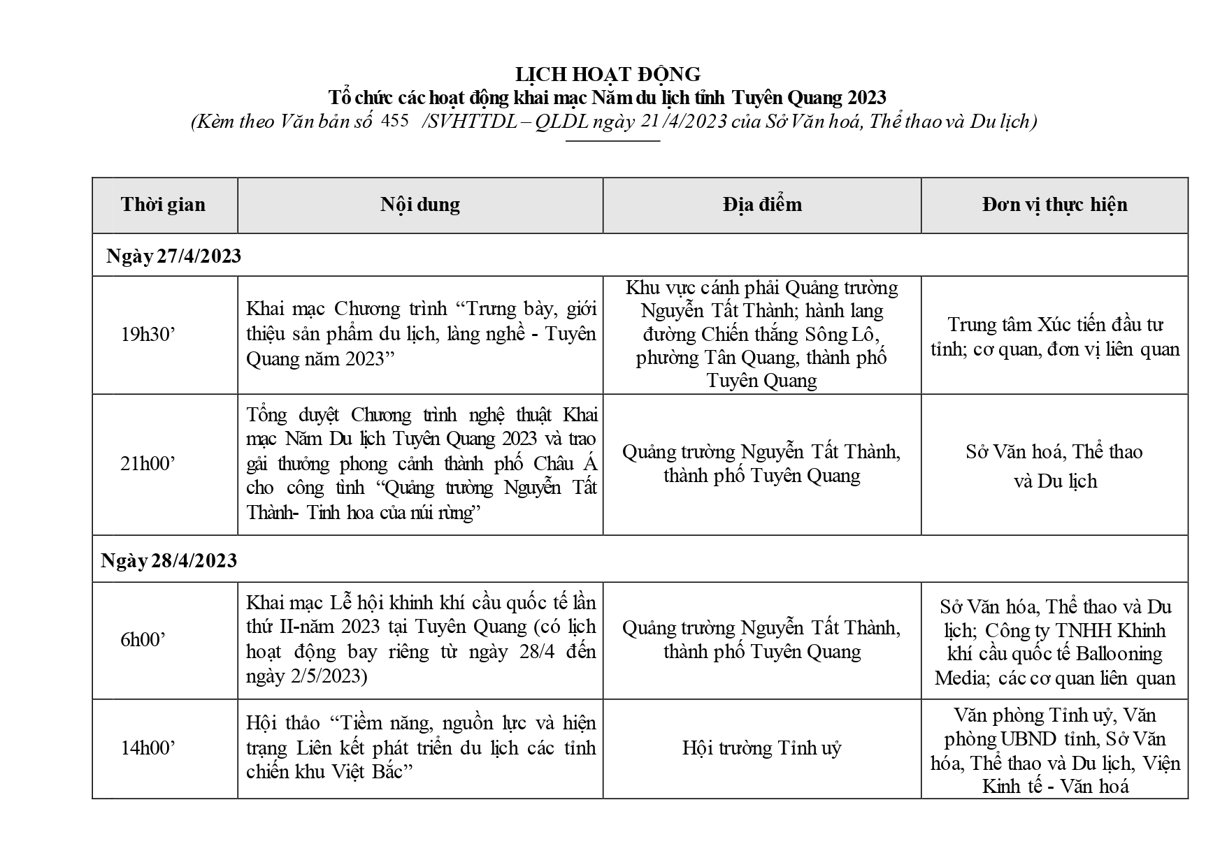 Lịch các hoạt động Tổ chức khai mạc Năm du lịch tỉnh Tuyên Quang năm 2023 Ngày đăng: Thứ 4, 26/4/2023 - 10:32 Lượt xem: 152 Năm du lịch tỉnh Tuyên Quang 2023 là sự kiện thường niên nhằm kết nối các sản phẩm văn hóa - du lịch của tỉnh với cả nước và quốc tế, tạo bước phát triển mới cho du lịch Tuyên Quang. Bài viết liên quan Tạo động lực cho công nghiệp văn hóa phát triển Thứ 4, 19/4/2023 - 10:33 Tuyên Quang tìm hiểu thị trường du lịch tại Cần Thơ Thứ 3, 11/4/2023 - 8:21 Khu du lịch sinh thái thác Bản Ba sẵn sàng cho mùa du lịch 2023 Thứ 3, 11/4/2023 - 8:1