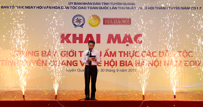 Phó Chủ tịch UBND tỉnh Nguyễn Hải Anh phát biểu tại Lễ khai mạc Trưng bày, giới thiệu ẩm thực các dân tộc tỉnh Tuyên Quang và Lễ hội Bia Hà Nội năm 2017.