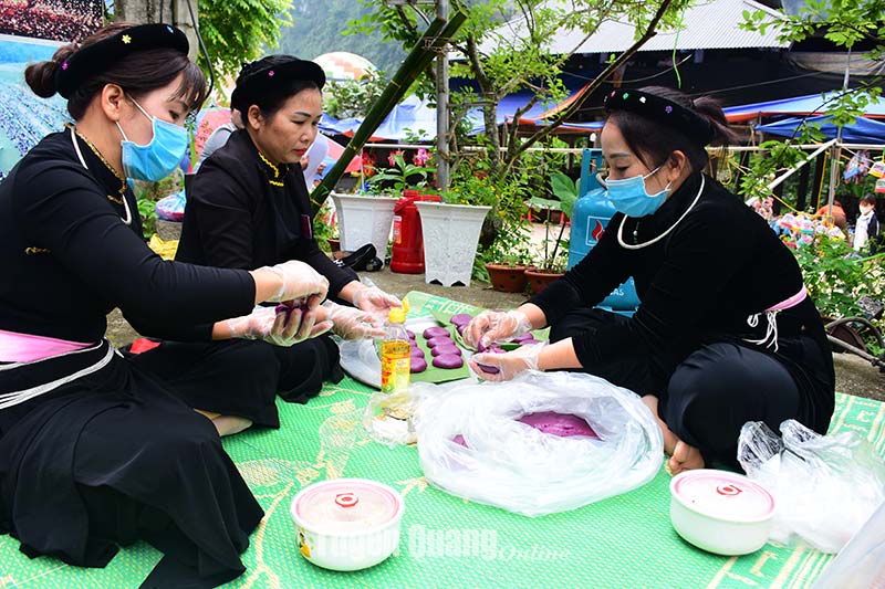 Người dân xã Phúc Sơn (Lâm Bình) làm bánh dày với nhiều màu sắc khác nhau.