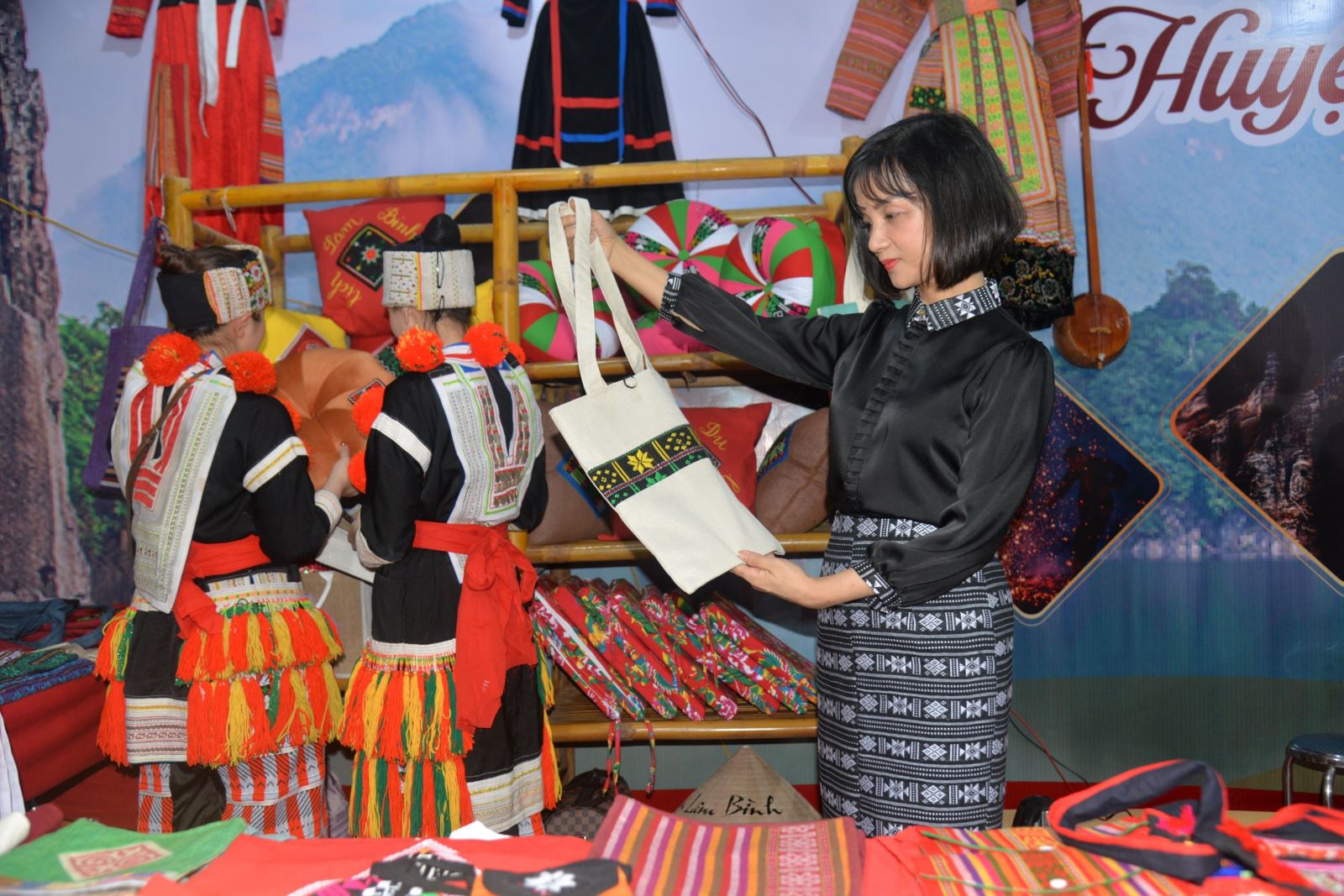 Các sản phẩm lưu niệm từ thổ cẩm huyện Lâm Bình được trưng bày, giới thiệu sản phẩm du lịch, làng nghề tỉnh Tuyên Quang năm 2023.