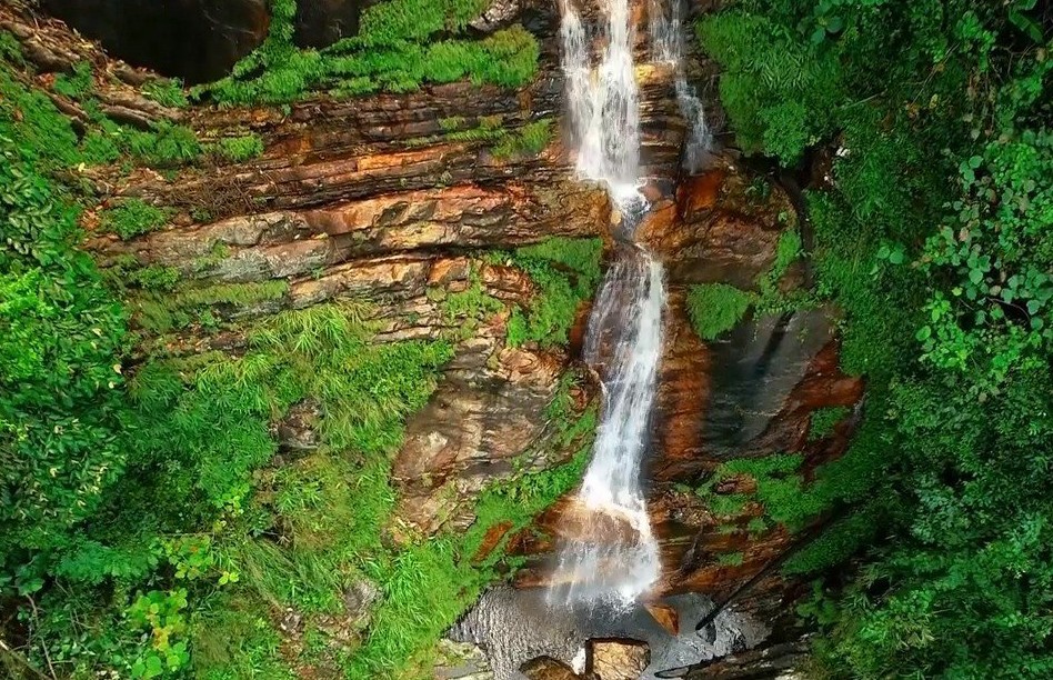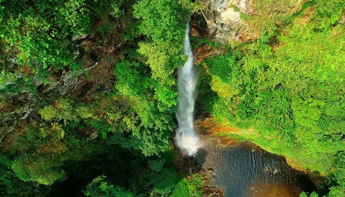 Thác Mạ Héc nhìn từ trên cao, xung quanh là rừng nguyên sinh Cham Chu.