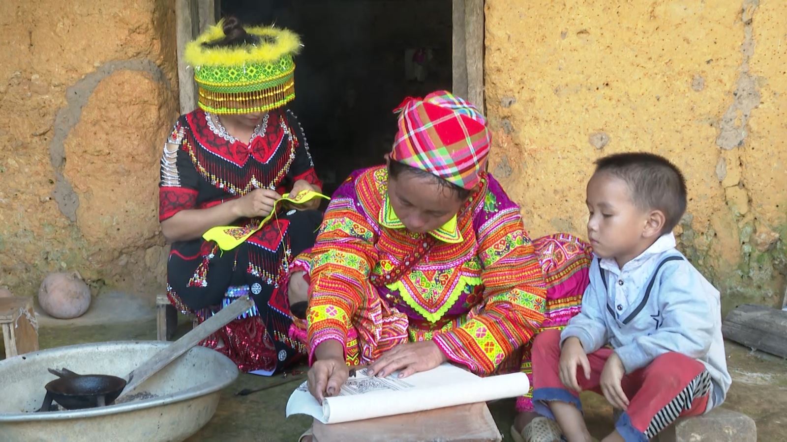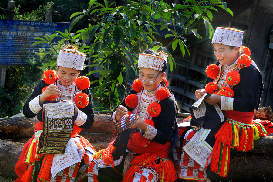 Người Dao đỏ huyện Lâm Bình thể hiện kỹ năng thêu tinh xảo trên vải thổ cẩm.