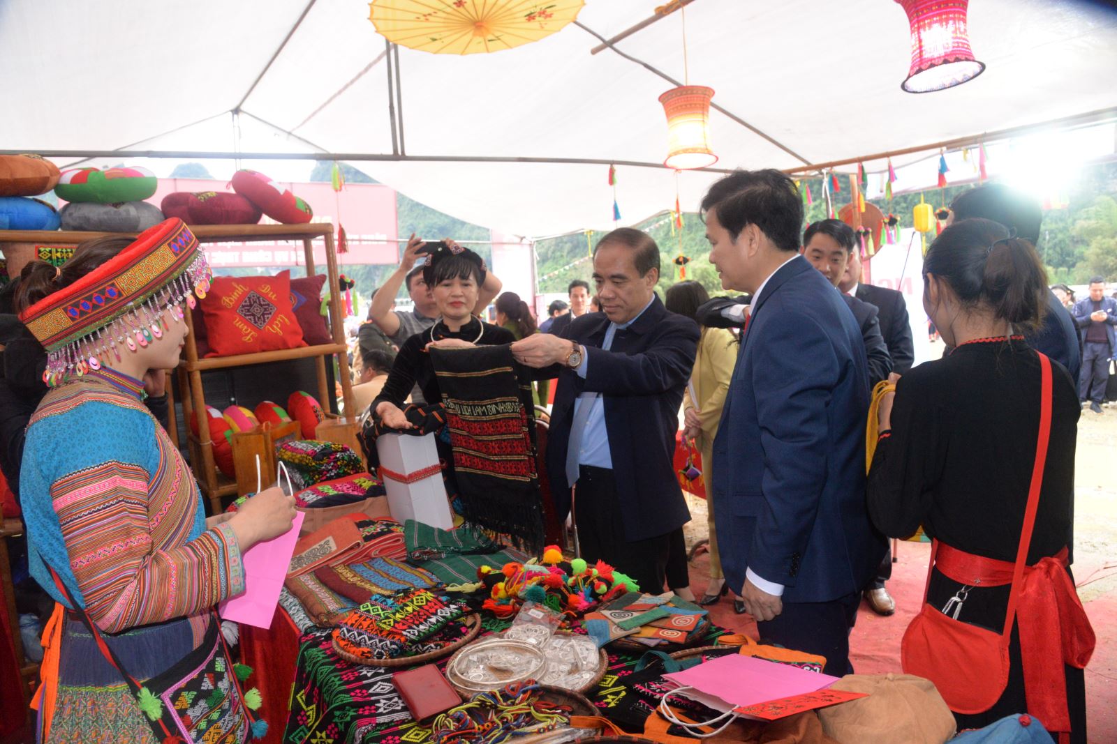 Đồng chí Bí thư Tỉnh ủy Chẩu Văn Lâm thăm quan gian hàng thổ cẩm huyện Lâm Bình.