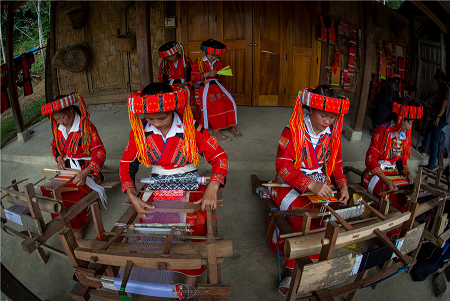 bằng cách dệt, nhuộm, thêu thùa thủ công cầu kỳ, sặc sỡ.