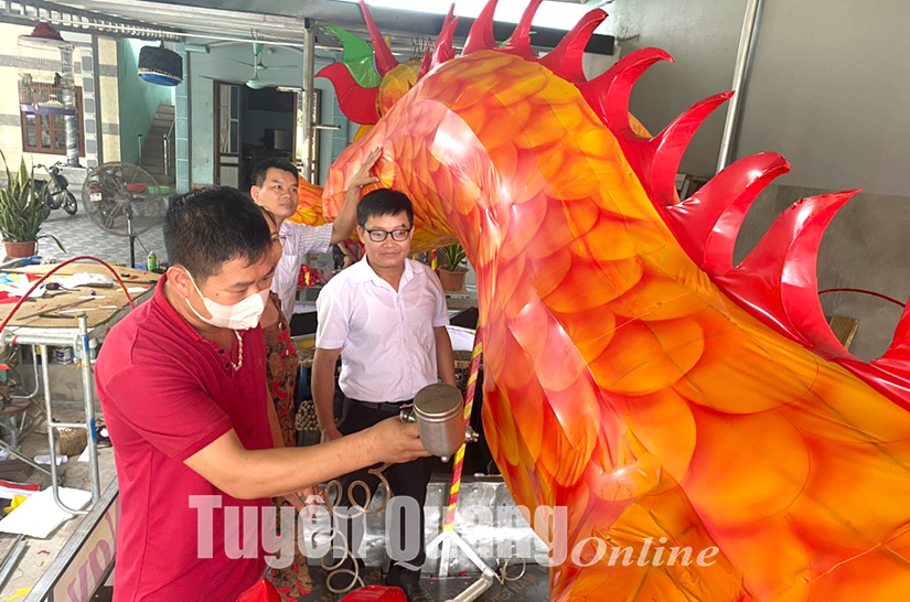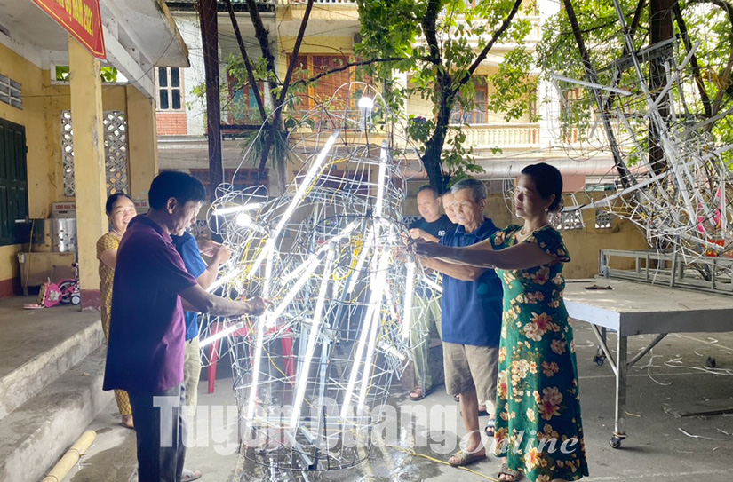 Những ngày này tại các xã, phường, tổ dân phố trên địa bàn thành phố Tuyên Quang, không khí làm mô hình đèn Trung thu đã rất sôi động, hăng hái. Tại tổ 6, phường Tân Quang, nơi có truyền thống làm đèn Trung thu lâu đời nhất, không khí làm đèn Trung thu diễn ra hết sức sôi nổi. Có cả những cụ già gần 80 tuổi, có em nhỏ mới 10 tuổi cũng tích cực tham gia trang trí, tiếp nước, phục vụ cho các tổ tham gia làm mô hình đèn “Rồng vàng trảy hội đêm trăng”. Anh Đỗ Văn Trung, người dân trong tổ phụ trách mảng ánh sáng của mô hình cho biết: “Chúng tôi làm cả ngày, cả đêm, có khi say sưa còn quên cả bữa trưa. Mỗi người đều được phân công một nhiệm vụ nên công việc diễn ra rất khẩn trương trôi chảy”. Bà Nguyễn Thị Tuyên, Bí thư Chi bộ, Tổ trưởng tổ dân phố 6 cho biết, tổ dân phố chỉ huy động mỗi hộ đóng góp không quá 200 nghìn đồng. Cả tổ có 105 hộ, quyên góp được khoảng trên 20 triệu. Để hoàn thành mô hình “Rồng vàng trảy hội đêm trăng” kinh phí trên 70 triệu, do đó, chi bộ và tổ dân phố huy động sức mạnh lòng dân là chủ yếu. Tổ mời người có năng lực mỹ thuật tạo hình không gian để xây dựng, thống nhất ý tưởng. Sau khi có bản vẽ, tổ dân phố thành lập các tổ cơ khí, hàn, uốn khung; tổ ánh sáng, tổ trang trí. Các tổ đều là nhân dân tham gia, mỗi tổ có 8 người. Mô hình đang dần hoàn thiện với sự đầu tư về trí tuệ, công sức, bàn tay khéo léo của tất cả người dân trong tổ.