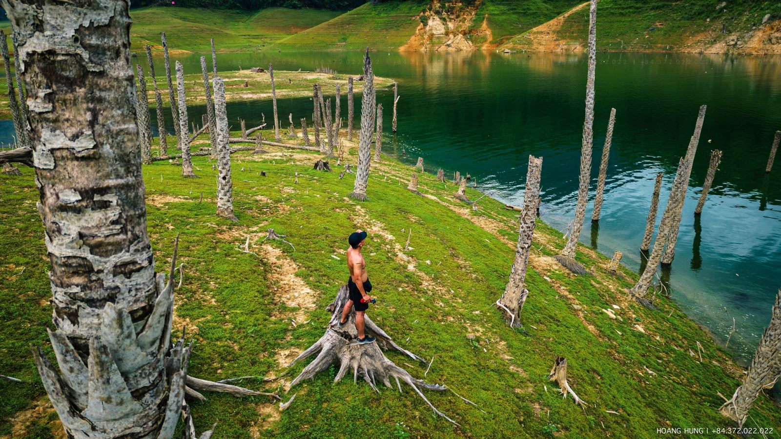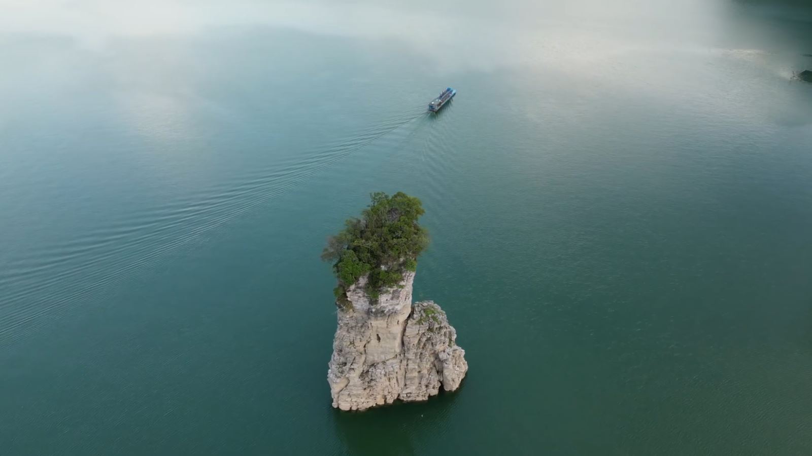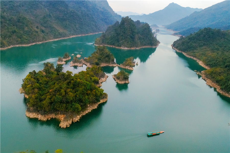 Những đảo đá vôi ẩn hiện giữa mặt hồ, giống một góc di sản thiên nhiên Hạ Long.