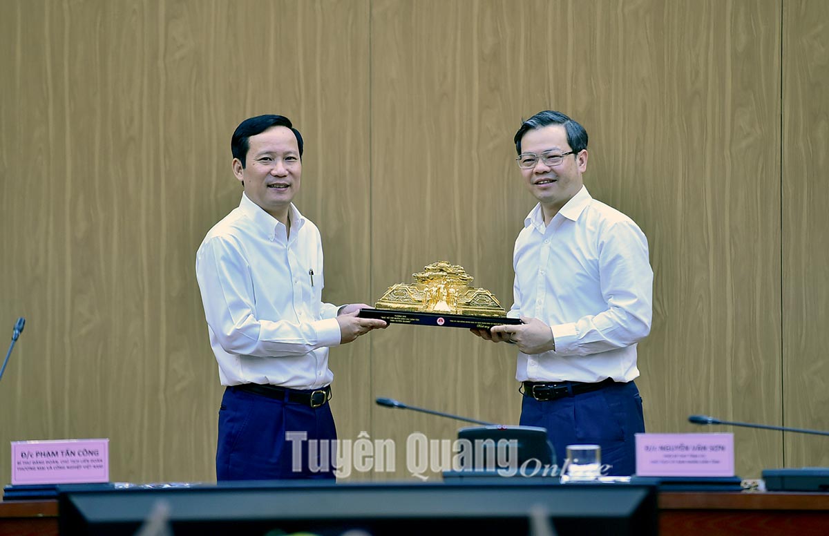 Đồng chí Nguyễn Văn Sơn, Phó Bí thư Tỉnh ủy, Chủ tịch UBND tỉnh tặng đồng chí Phạm Tấn Công Chủ tịch VCCI bức phù điêu Tượng đài Bác Hồ với nhân dân các dân tộc tỉnh Tuyên Quang.