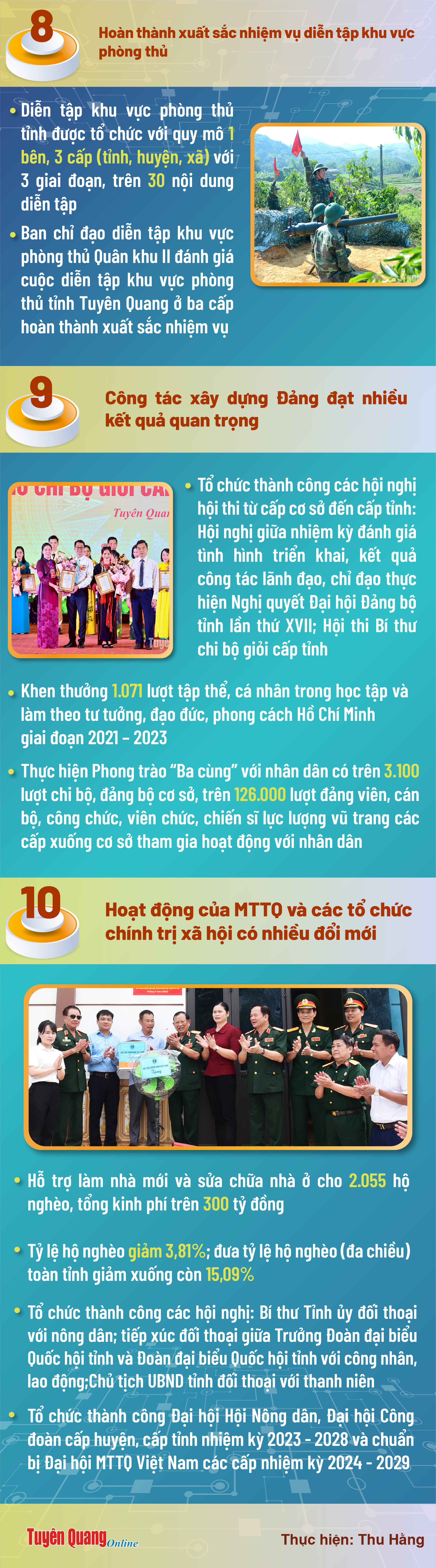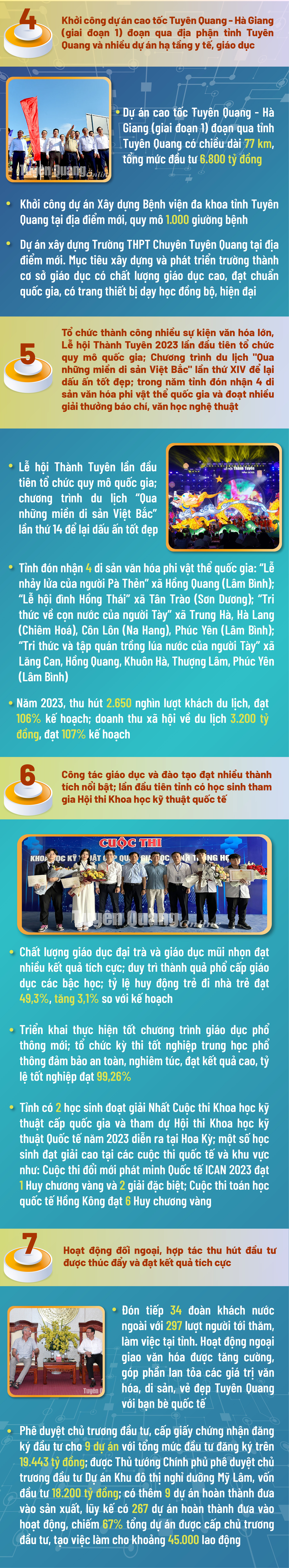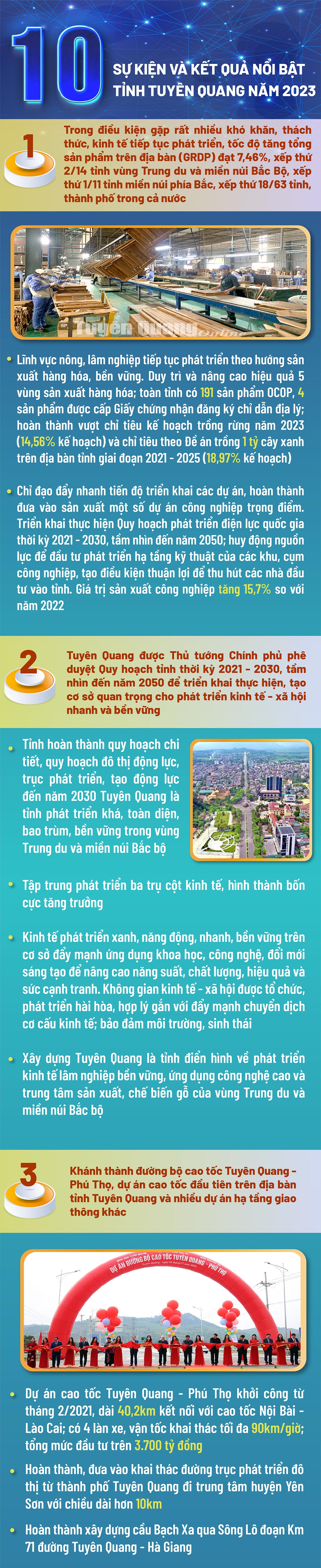 10 sự kiện và kết quả nổi bật tỉnh Tuyên Quang năm 2023 Ngày đăng: Chủ nhật, 7/1/2024 - 8:57 Lượt xem: 599 Năm 2023 là năm có nhiều sự kiện quan trọng có ý nghĩa đặc biệt; với bản lĩnh, sự sáng tạo, chủ động trong lãnh đạo, chỉ đạo điều hành, sự đoàn kết, thống nhất, quyết tâm cao của cả hệ thống chính trị, sự nỗ lực, đồng thuận của nhân dân các dân tộc trong tỉnh, sự đồng hành của cộng đồng doanh nghiệp, Tuyên Quang đã đạt được những kết quả quan trọng trên tất cả các lĩnh vực, tạo thế và lực mới đưa tỉnh Tuyên Quang ngày một phát triển, vươn lên. Theo TQĐT. Bài viết liên quan Chương trình Cà phê doanh nhân tháng 12 Thứ 7, 30/12/2023 - 20:0 Tuyên Quang nỗ lực thực hiện thắng lợi các mục tiêu, nhiệm vụ phát triển kinh tế - xã hội năm 2023 Thứ 5, 14/12/2023 - 15:53 Chè Thái Nguyên và Tuyên Quang - Tiềm năng và thế mạnh Thứ 2, 4/12/2023 - 16:24