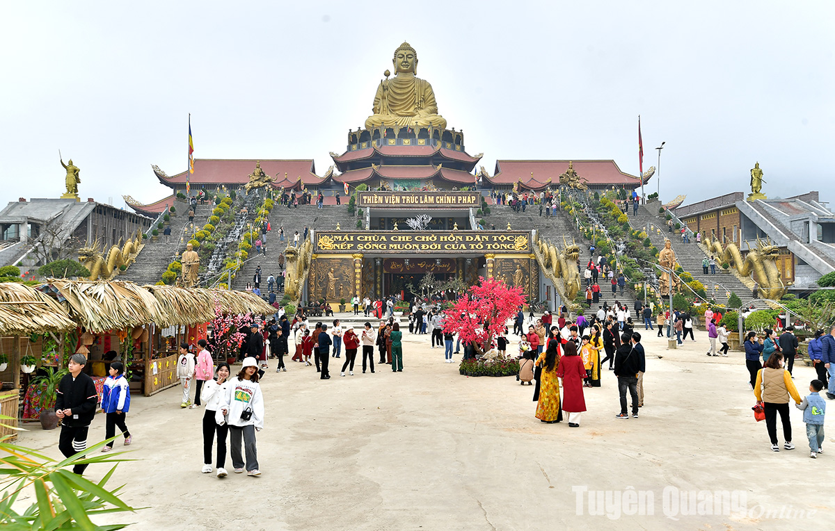 Sáng mùng 5 Tết, nhân dân, du khách đi lễ, vãn cảnh Thiền viện Trúc lâm Chính pháp Tuyên Quang.
