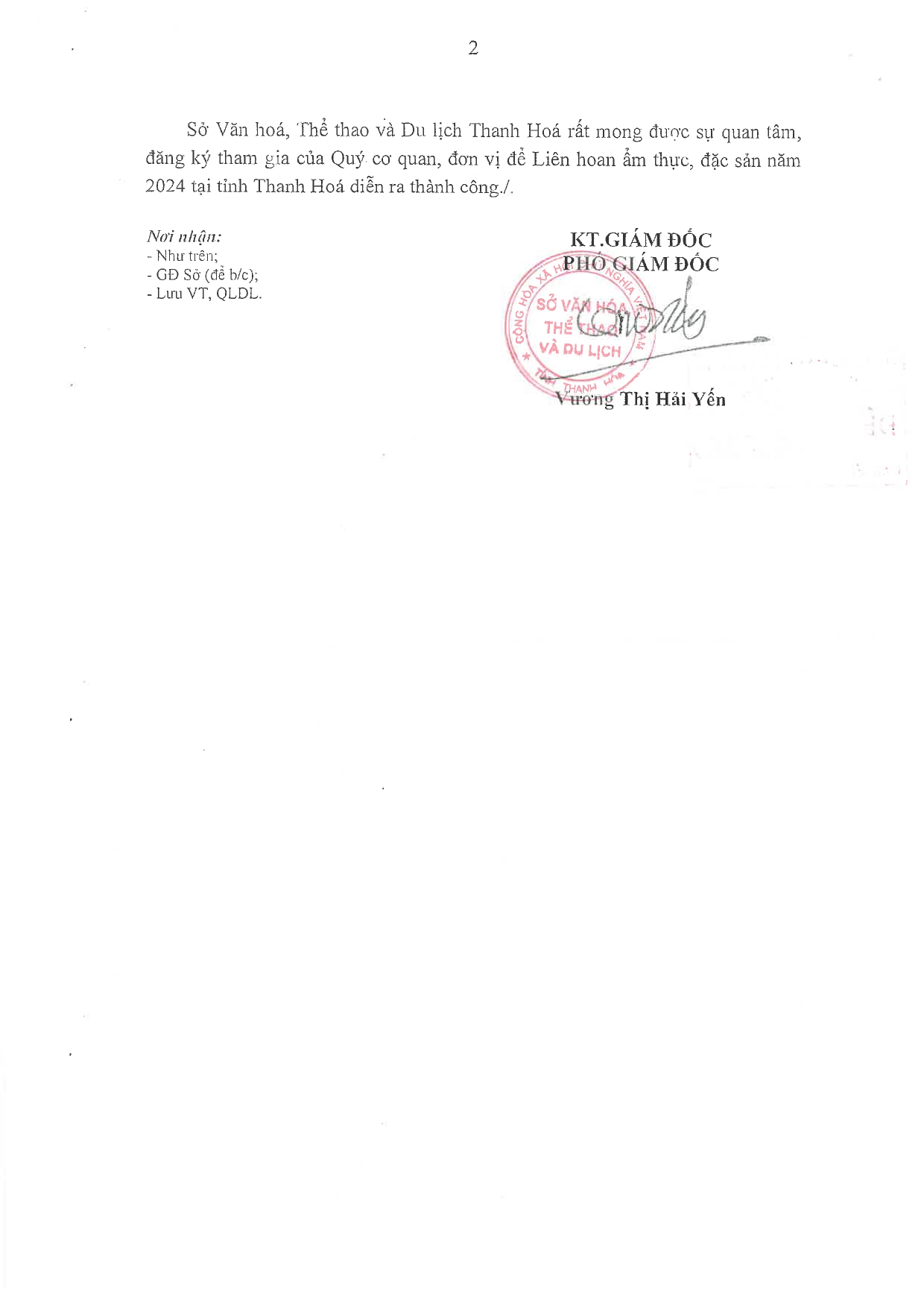 Các đơn vị, tổ chức, cá nhân đăng ký tham gia gian hàng tại Liên hoan ẩm thực, đặc sản năm 2024 tại tỉnh Thanh Hóa gửi về Trung tâm Xúc tiến đầu tư tỉnh trước ngày 20/02/2024.