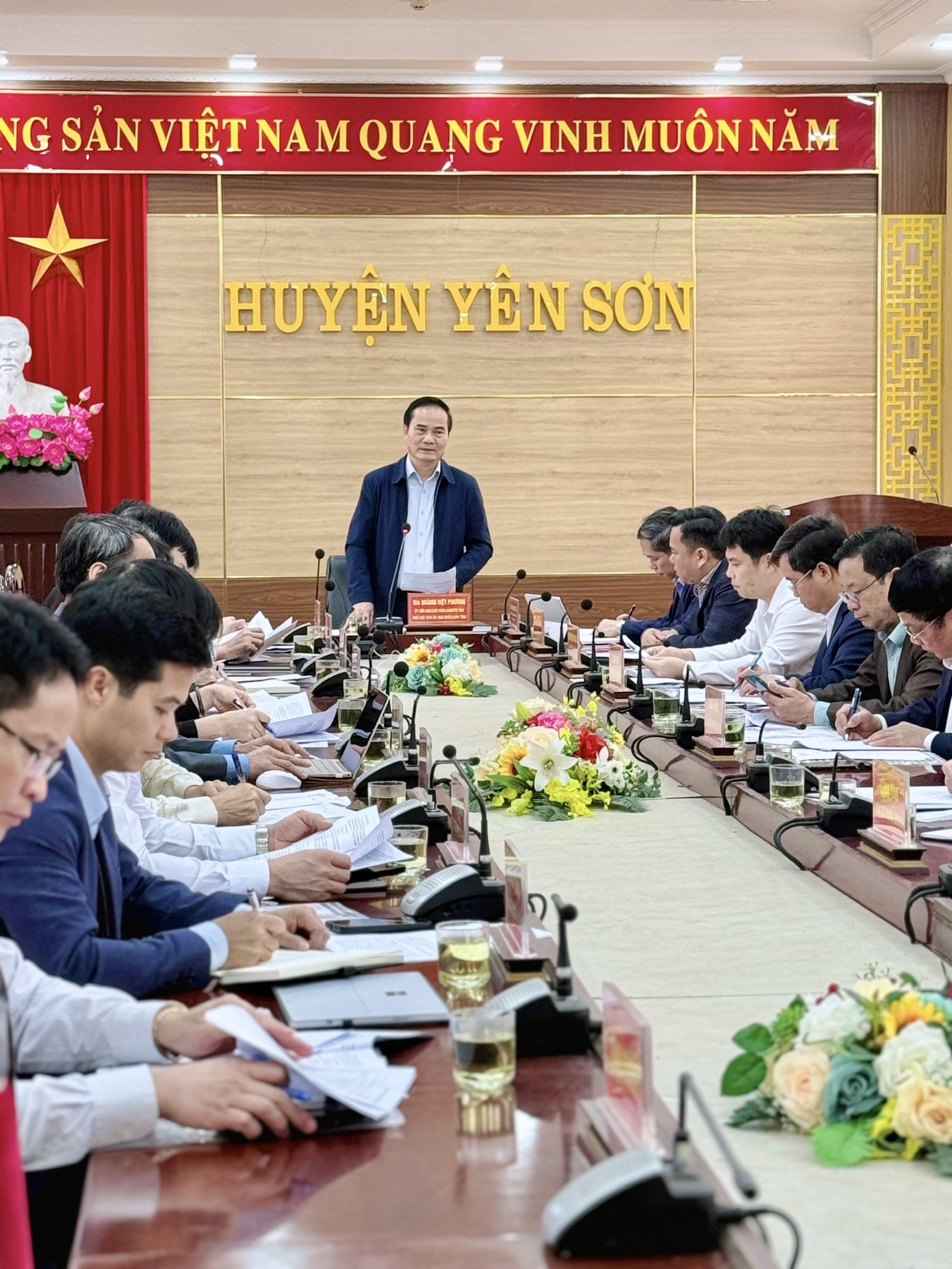 Tại buổi làm việc Phó Chủ tịch UBND tỉnh Hoàng Việt Phương đã đánh giá cao về kết quả đạt được của huyện Yên Sơn trong việc thực hiện các công trình trọng điểm của tỉnh. Đồng chí đánh giá huyện có nhiều tiềm năng về cảnh quan thiên nhiên, di tích lịch sử, bản sắc văn hóa, nhiều đặc sản nổi trội, tuy nhiên việc phát triển chưa xứng với thế mạnh của vùng, đề nghị huyện chú trọng phát triển du lịch có trọng tâm, trọng điểm, bài bản, quy mô, quan tâm cơ sở hạ tầng đường giao thông, viễn thông, internet, xây dựng thương hiệu du lịch riêng của huyện.
