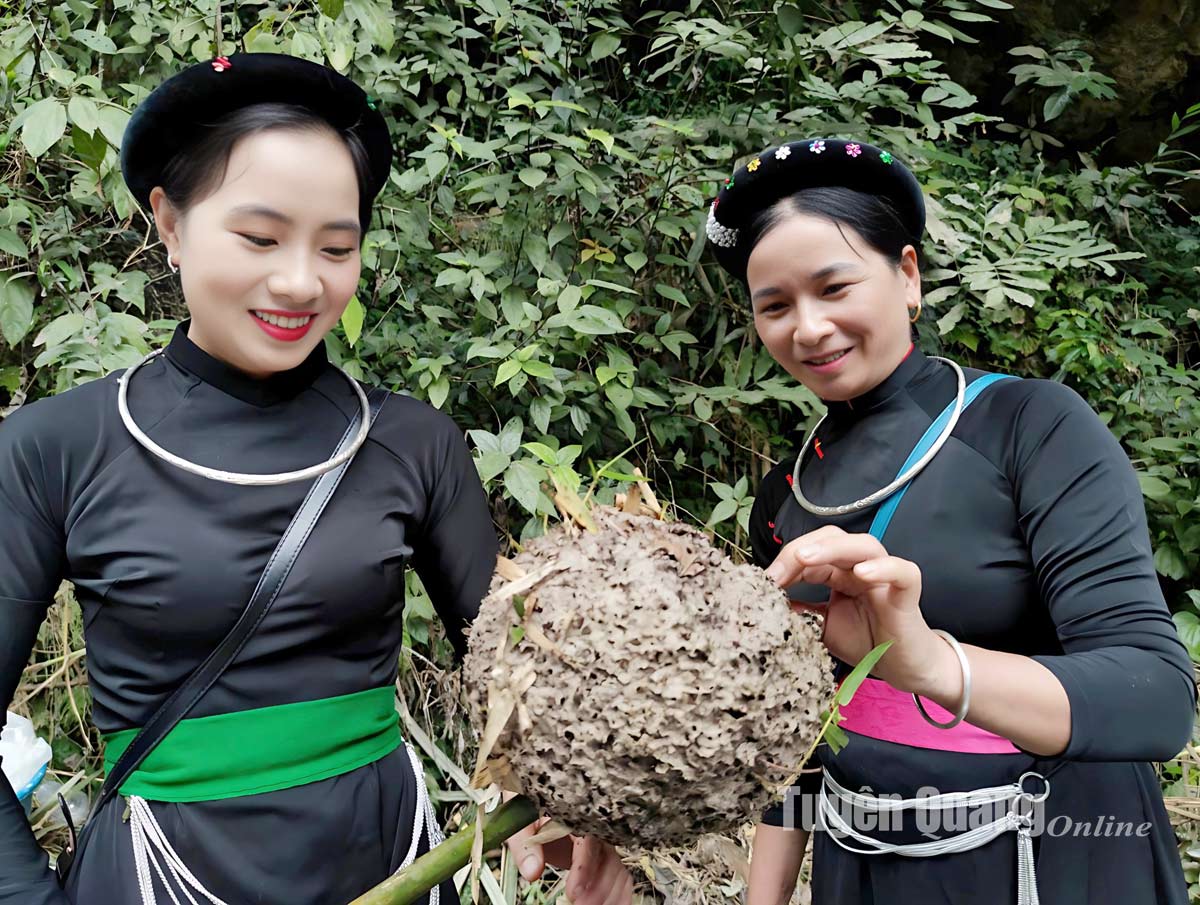 Chị Chẩu Thị Tiêu (bên phải), thôn Bản Thàng, xã Phúc Yên (Lâm Bình) kiểm tra chất lượng tổ kiến vừa được thu hái.
