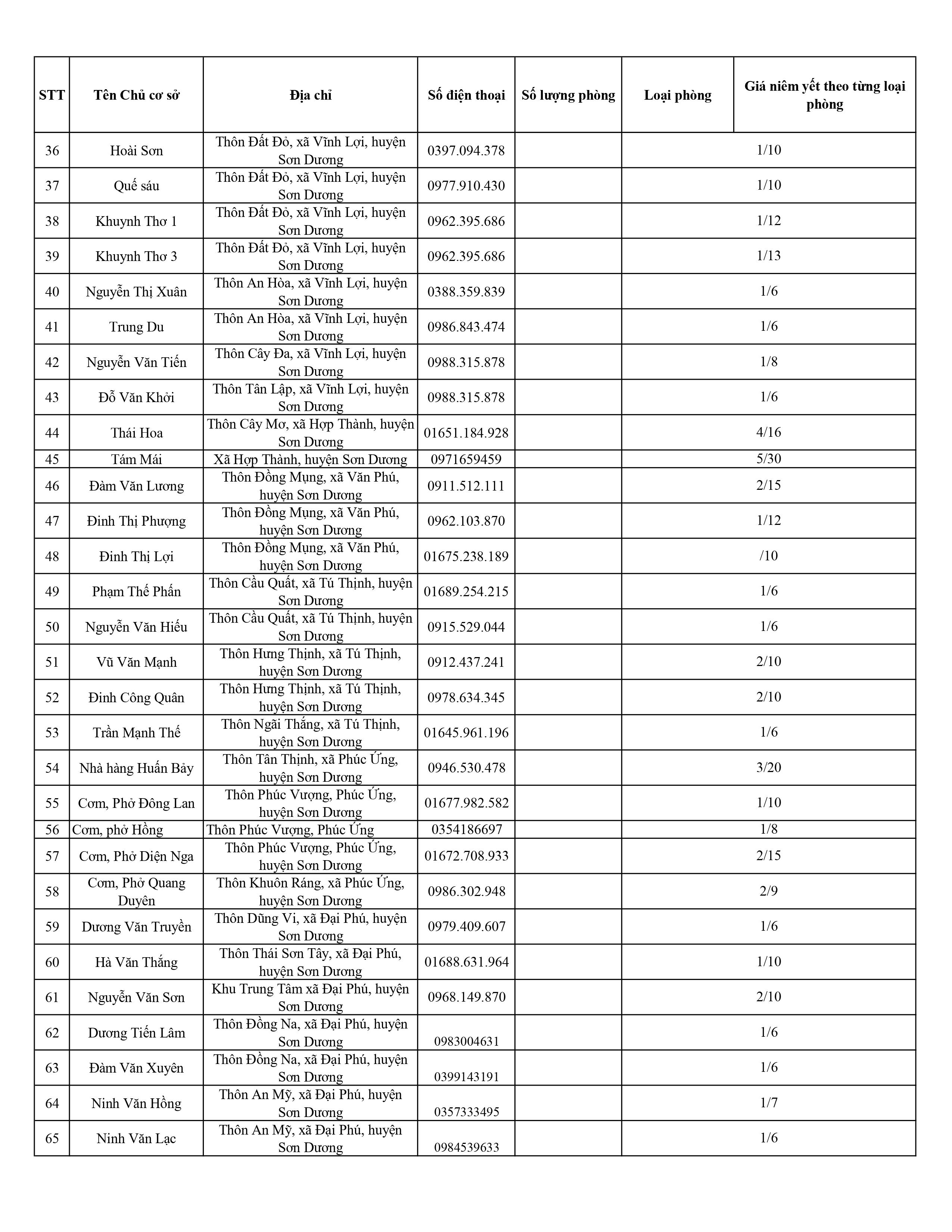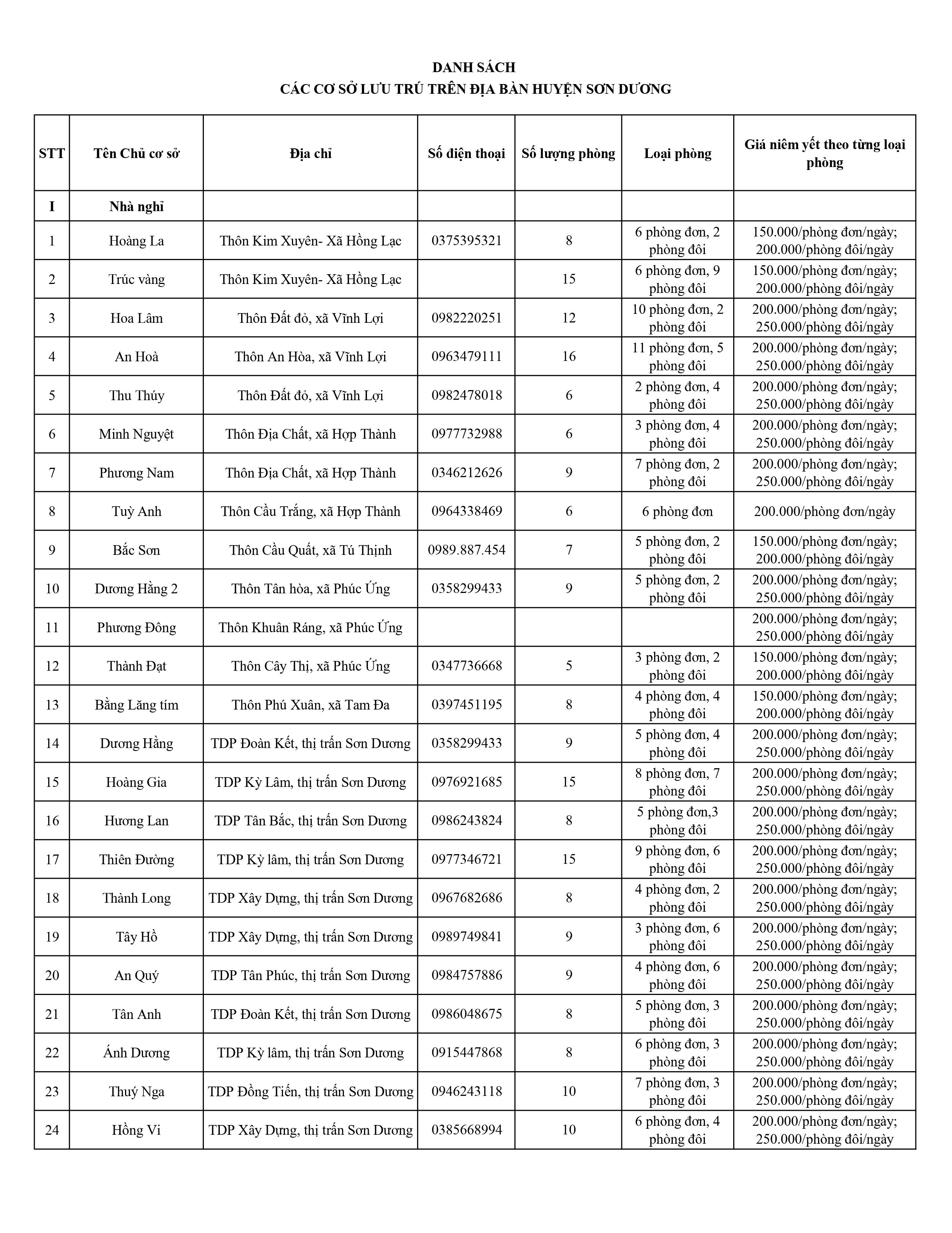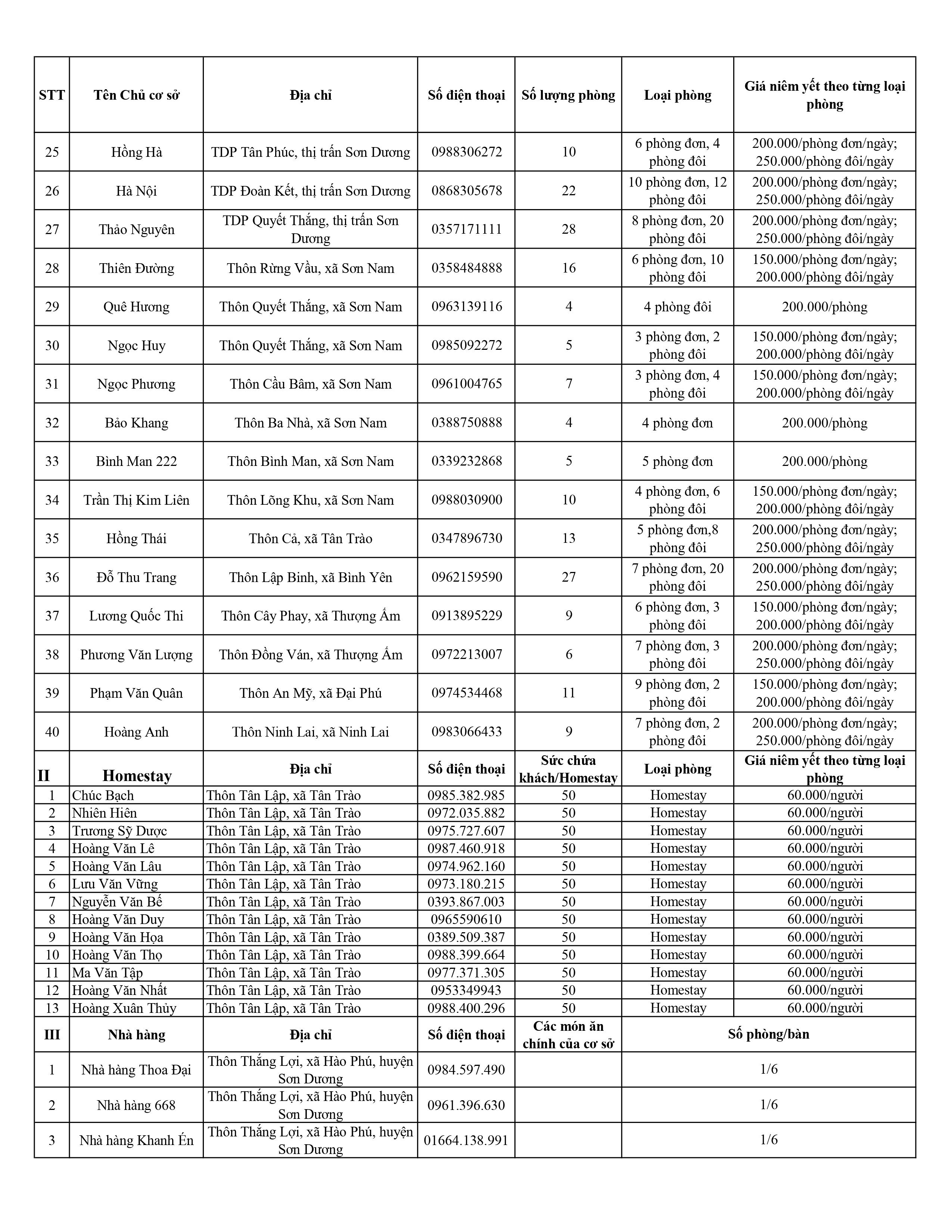 Danh sách Cơ sở lưu trú, nhà hàng, homestay tại huyện Sơn Dương Ngày đăng: Thứ 4, 14/8/2024 - 15:14 Lượt xem: 133 Danh sách Cơ sở lưu trú, nhà hàng, homestay tại huyện Sơn Dương năm 2024 Bài viết liên quan Danh sách các hãng taxi tại Tuyên Quang Thứ 2, 20/5/2024 - 7:40 DANH SÁCH CÁC DOANH NGHIỆP KINH DOANH DU LỊCH TẠI TỈNH TUYÊN QUANG Thứ 5, 5/10/2023 - 15:2 Danh sách cơ sở lưu trú tại thành phố Tuyên Quang Thứ 5, 7/9/2023 - 11:24