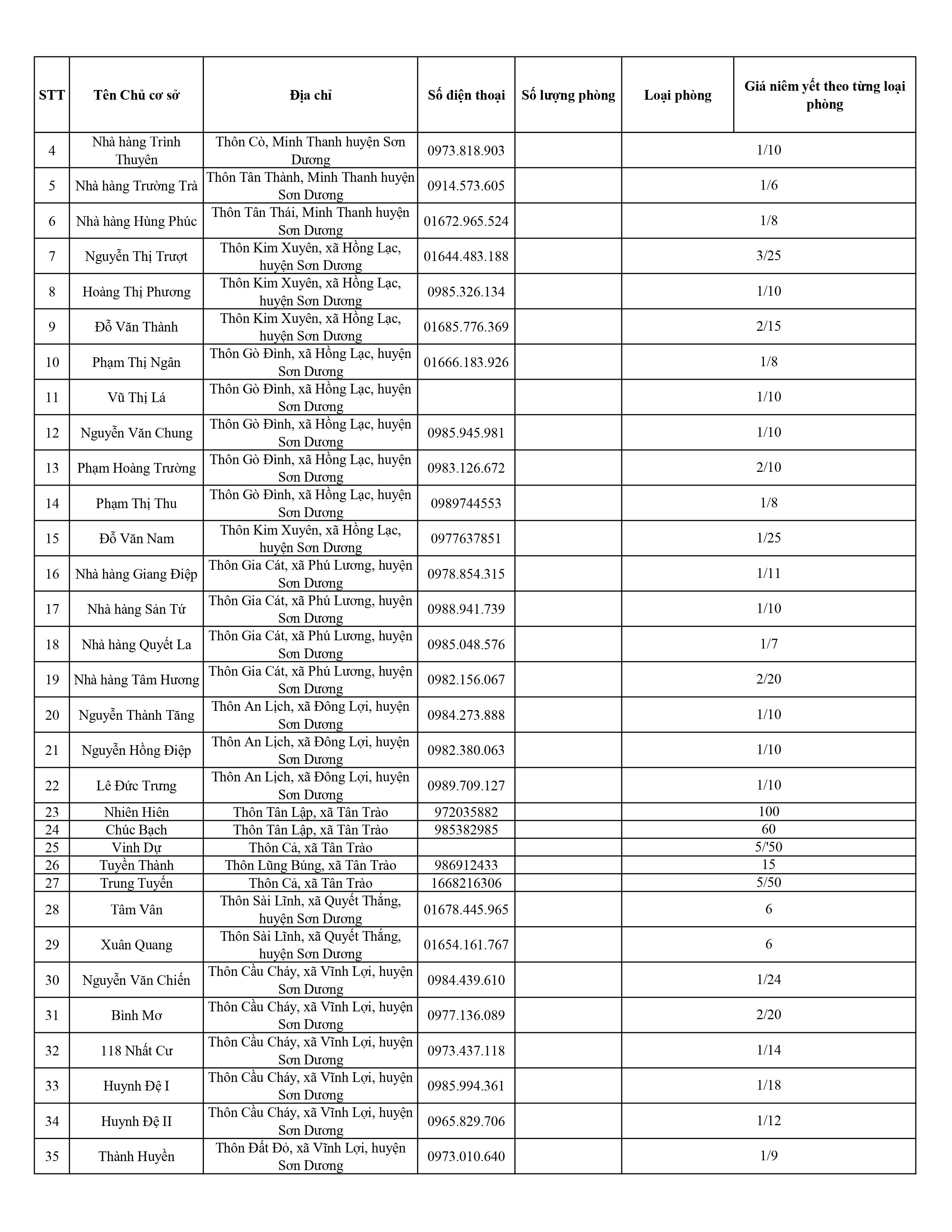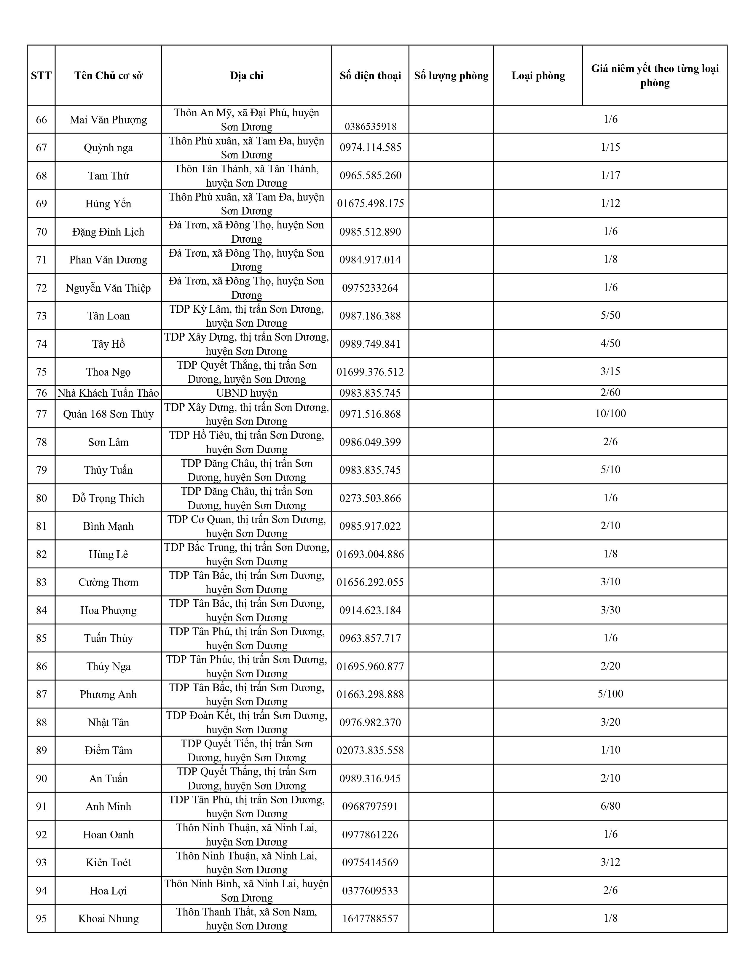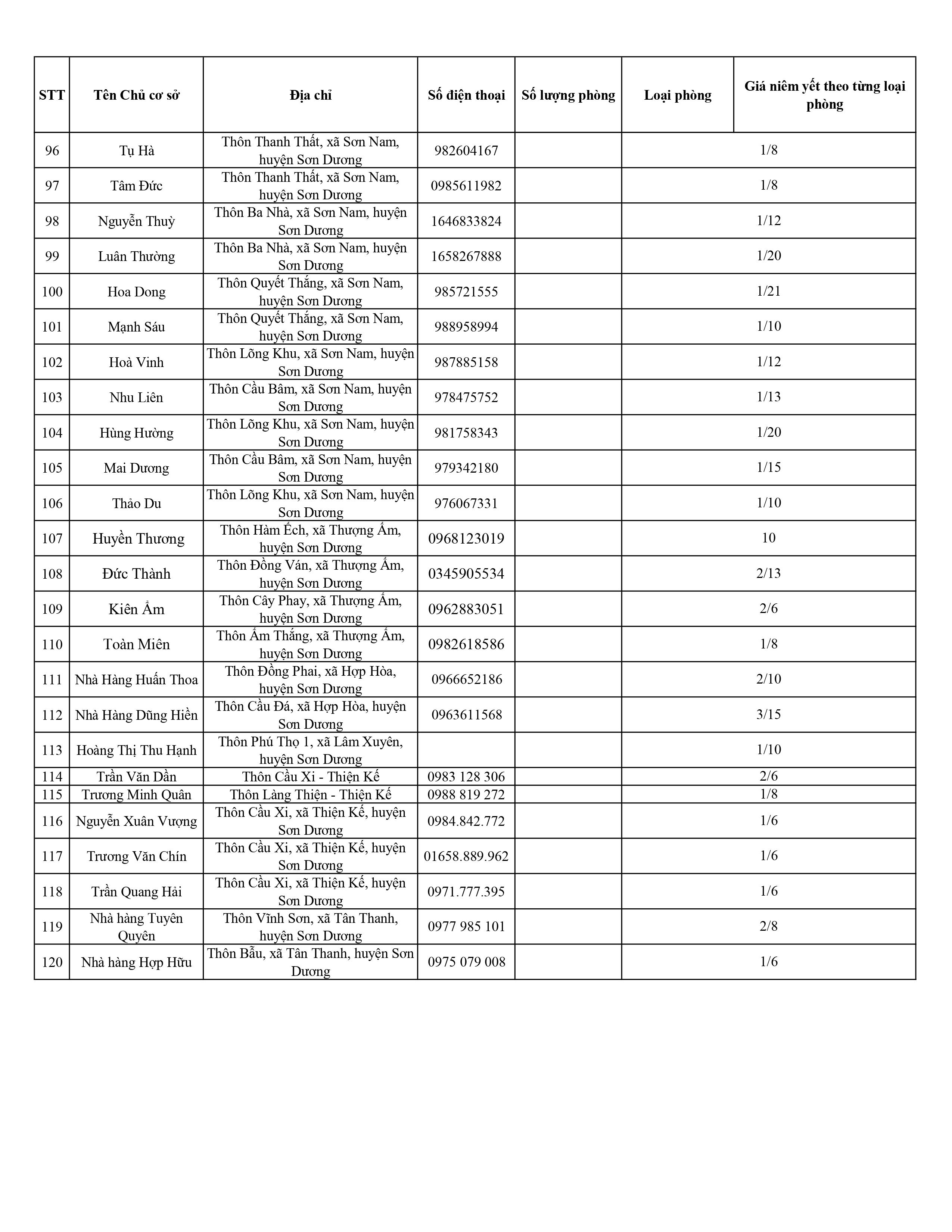 Danh sách Cơ sở lưu trú, nhà hàng, homestay tại huyện Sơn Dương Ngày đăng: Thứ 4, 14/8/2024 - 15:14 Lượt xem: 133 Danh sách Cơ sở lưu trú, nhà hàng, homestay tại huyện Sơn Dương năm 2024 Bài viết liên quan Danh sách các hãng taxi tại Tuyên Quang Thứ 2, 20/5/2024 - 7:40 DANH SÁCH CÁC DOANH NGHIỆP KINH DOANH DU LỊCH TẠI TỈNH TUYÊN QUANG Thứ 5, 5/10/2023 - 15:2 Danh sách cơ sở lưu trú tại thành phố Tuyên Quang Thứ 5, 7/9/2023 - 11:24