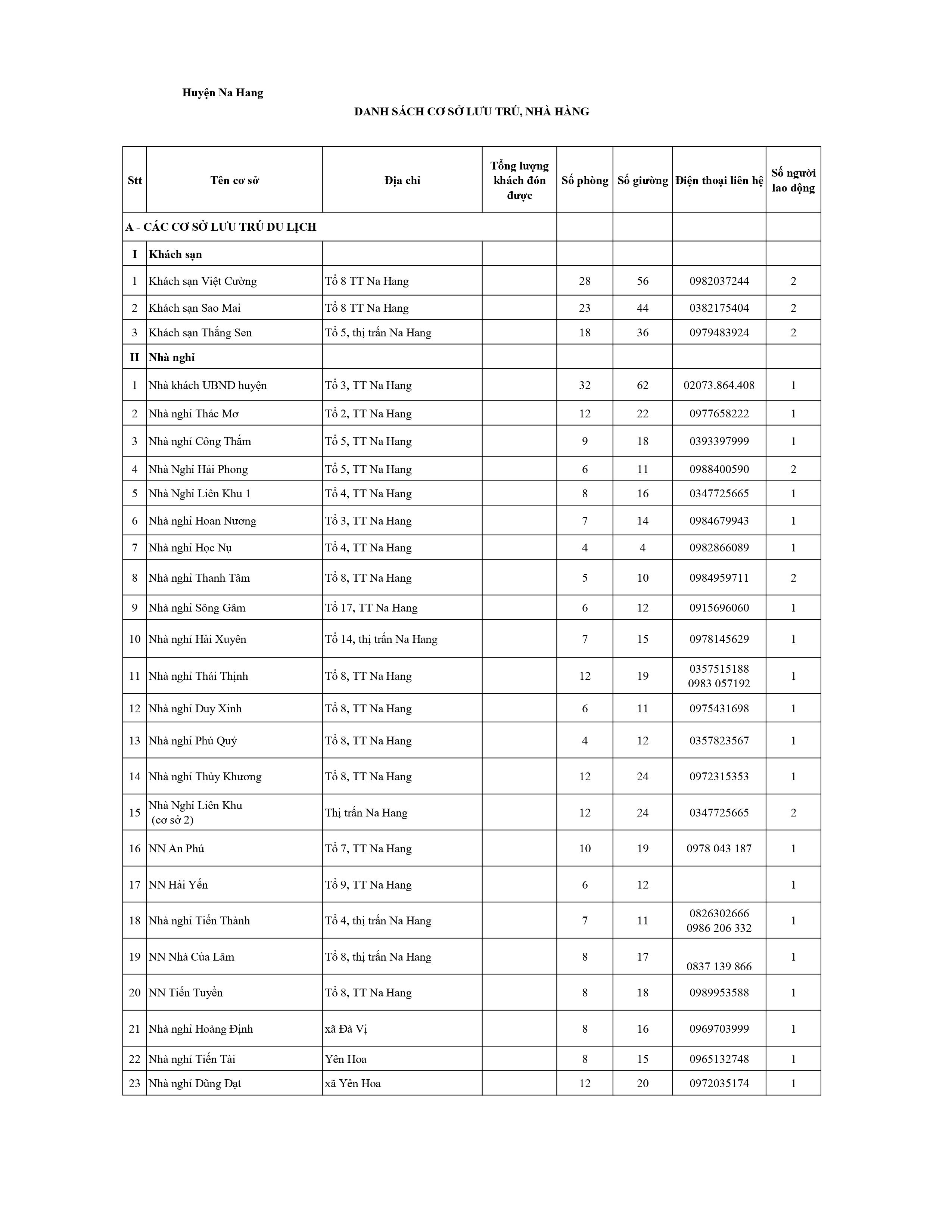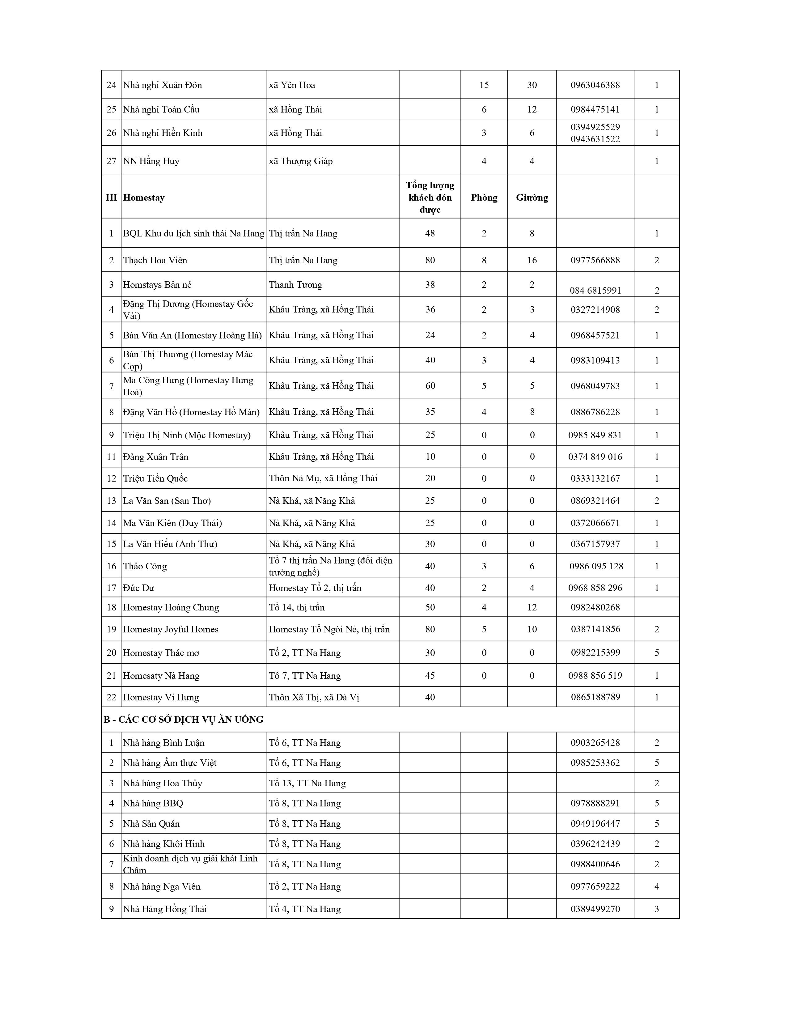 Danh sách Cơ sở lưu trú, nhà hàng, homestay tại huyện Na Hang năm 2024 Ngày đăng: Thứ 4, 14/8/2024 - 16:22 Lượt xem: 116 Danh sách Cơ sở lưu trú, nhà hàng, homestay tại huyện Na Hang năm 2024 Bài viết liên quan Danh sách Cơ sở lưu trú, nhà hàng, homestay tại huyện Chiêm Hóa năm 2024 Thứ 4, 14/8/2024 - 16:20 Danh sách Cơ sở lưu trú, nhà hàng, homestay tại huyện Hàm Yên năm 2024 Thứ 4, 14/8/2024 - 16:18 Danh sách Cơ sở lưu trú, nhà hàng, homestay tại huyện Yên Sơn năm 2024 Thứ 4, 14/8/2024 - 15:42