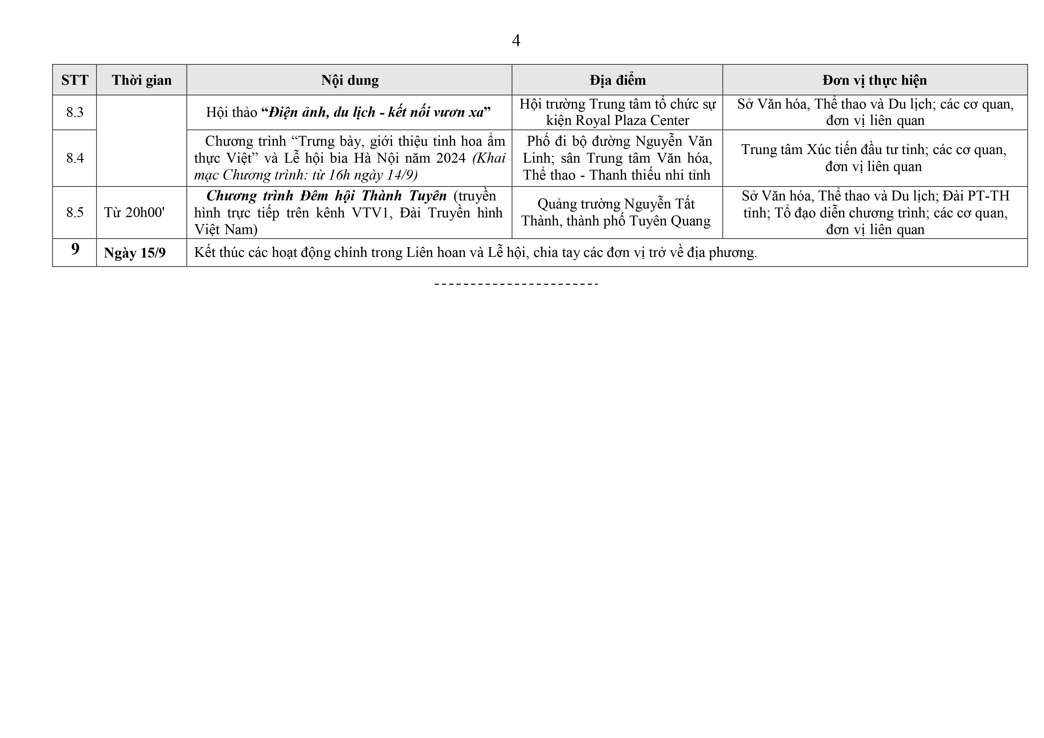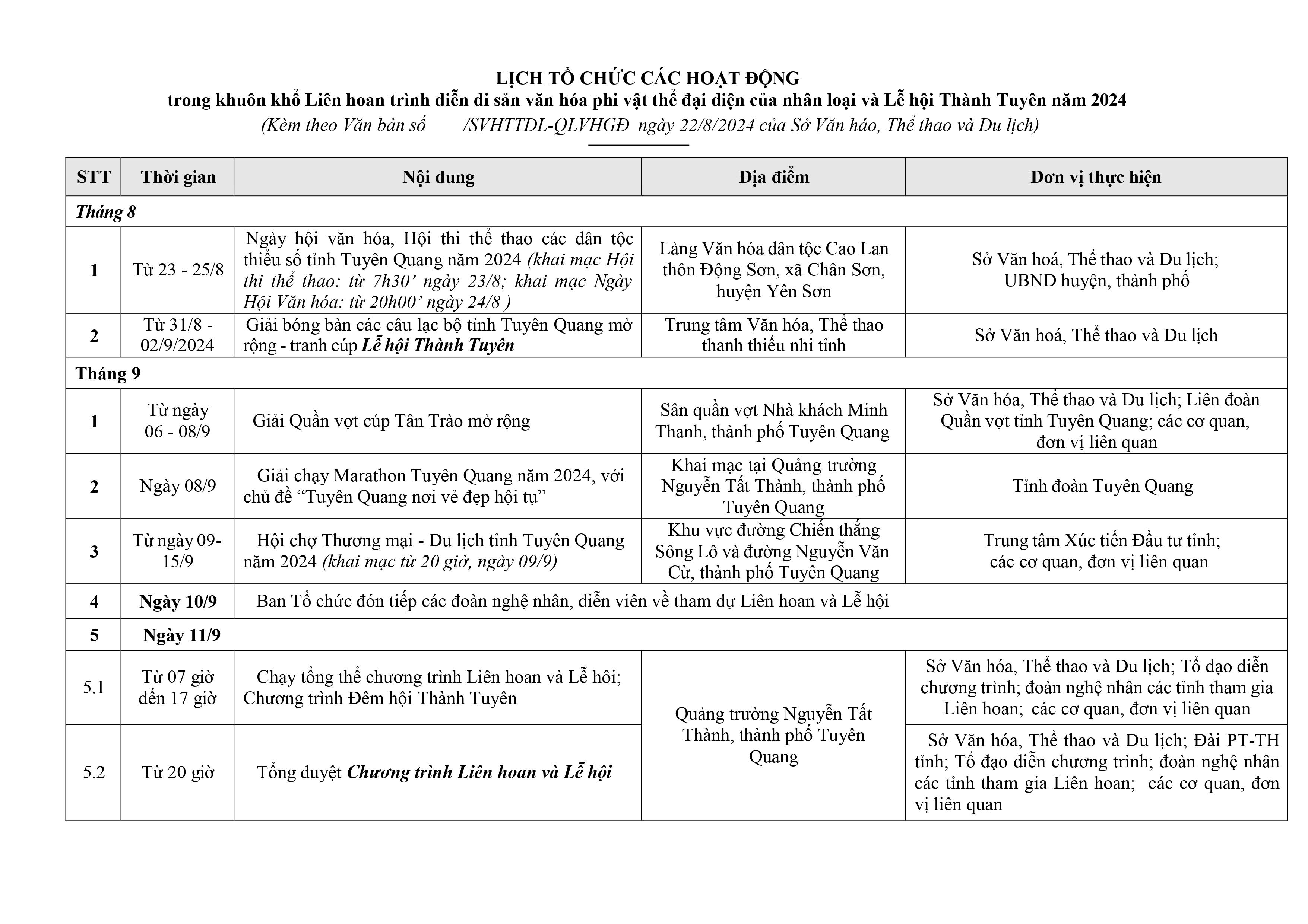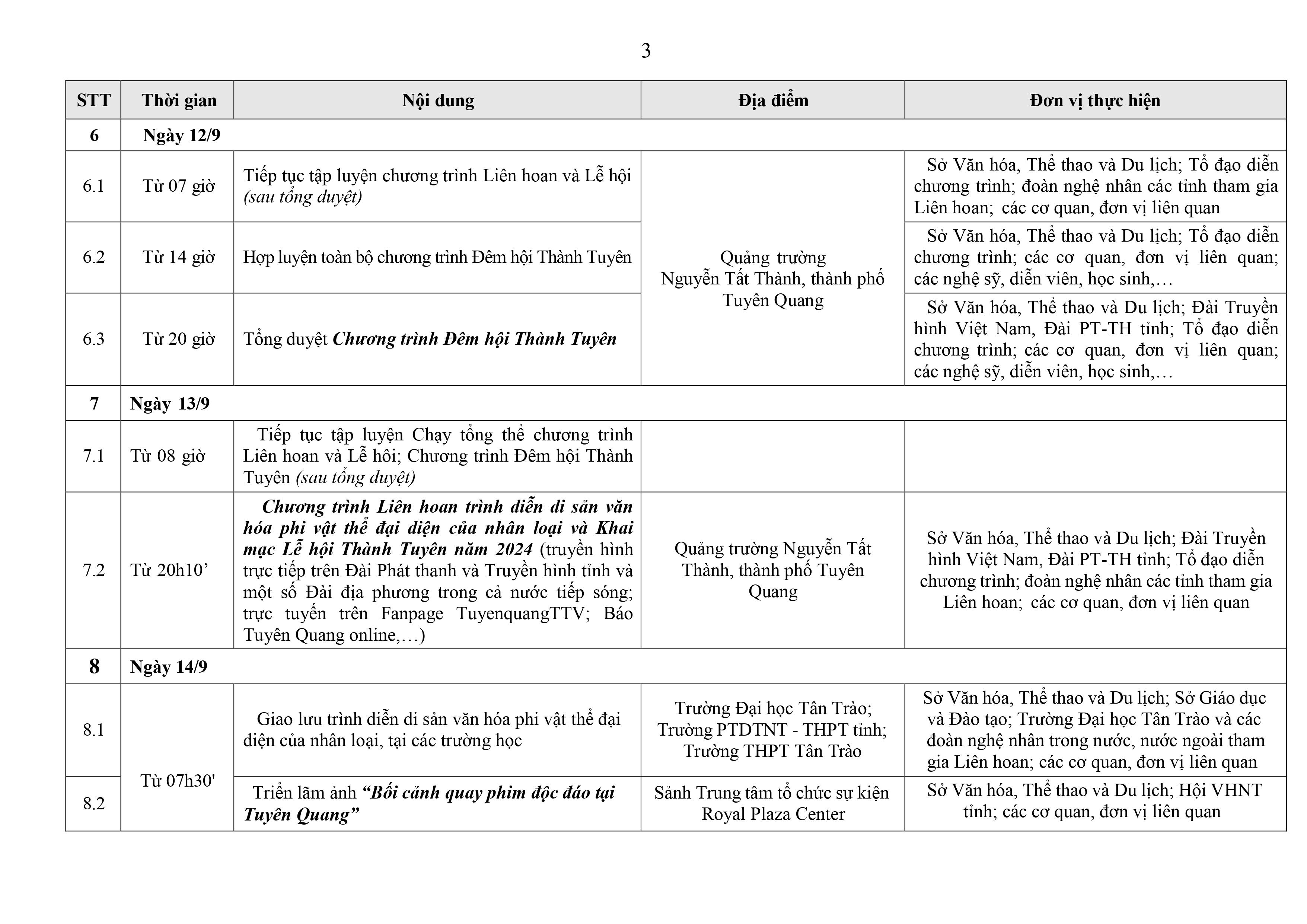 Lịch tổ chức các hoạt động trong khuôn khổ Liên hoan trình diễn di sản văn hóa phi vật thể đại diện của nhân loại và Lễ hội Thành Tuyên năm 2024 Ngày đăng: Thứ 6, 23/8/2024 - 8:2 Lượt xem: 236 Các hoạt động trong Liên hoan trình diễn di sản văn hóa phi vật thể đại diện của nhân loại và Lễ hội Thành Tuyên năm 2024 Bài viết liên quan Lễ viếng, Lễ truy điệu và Lễ an táng Tổng Bí thư Nguyễn Phú Trọng Thứ 4, 24/7/2024 - 11:0 Sắp diễn ra Lễ hội Khinh khí cầu quốc tế Tuyên Quang lần thứ III Thứ 2, 8/4/2024 - 9:2 LỄ HỘI ĐỀN HẠ, ĐỀN THƯỢNG, ĐỀN Ỷ LA NĂM 2024 Thứ 2, 4/3/2024 - 10:50