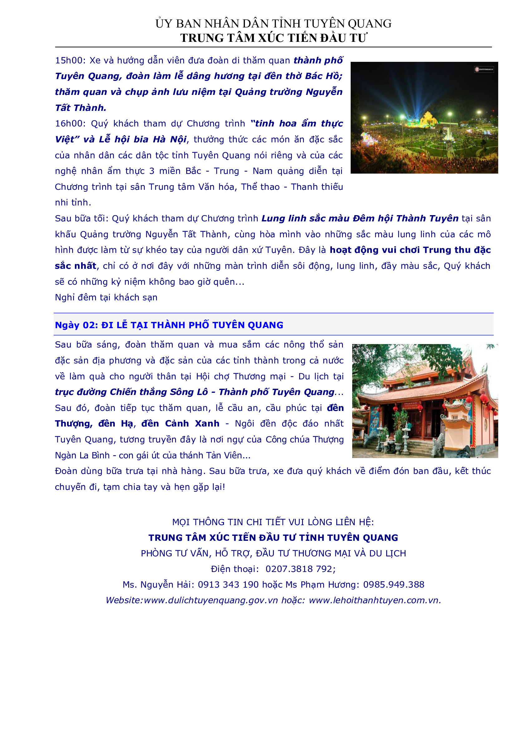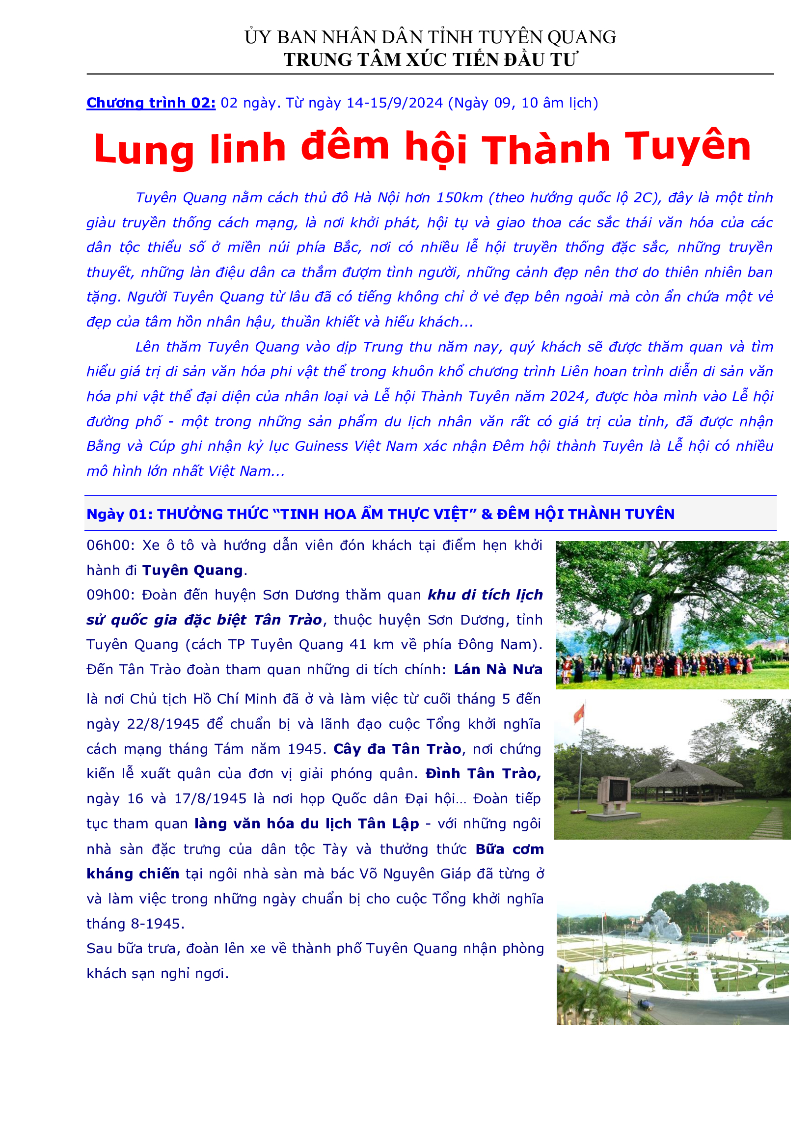 Chương trình 02: 02 ngày Lung linh đêm hội Thành Tuyên Ngày đăng: Thứ 2, 12/8/2024 - 8:41 Lượt xem: 397 Tuyên Quang nằm cách thủ đô Hà Nội hơn 150km (theo hướng quốc lộ 2C), đây là một tỉnh giàu truyền thống cách mạng, là nơi khởi phát, hội tụ và giao thoa các sắc thái văn hóa của các dân tộc thiểu số ở miền núi phía Bắc, nơi có nhiều lễ hội truyền thống đặc sắc, những truyền thuyết, những làn điệu dân ca thắm đượm tình người, những cảnh đẹp nên thơ do thiên nhiên ban tặng. Người Tuyên Quang từ lâu đã có tiếng không chỉ ở vẻ đẹp bên ngoài mà còn ẩn chứa một vẻ đẹp của tâm hồn nhân hậu, thuần khiết và hiếu khách... Lên thăm Tuyên Quang vào dịp Trung thu năm nay, quý khách sẽ được thăm quan và tìm hiểu giá trị di sản văn hóa phi vật thể trong khuôn khổ chương trình Liên hoan trình diễn di sản văn hóa phi vật thể đại diện của nhân loại và Lễ hội Thành Tuyên năm 2024, được hòa mình vào Lễ hội đường phố - một trong những sản phẩm du lịch nhân văn rất có giá trị của tỉnh, đã được nhận Bằng và Cúp ghi nhận kỷ lục Guiness Việt Nam xác nhận Đêm hội thành Tuyên là Lễ hội có nhiều mô hình lớn nhất Việt Nam... Bài viết liên quan Chương trình 01: (02 ngày) Trải nghiệm làm đèn Trung thu Thứ 2, 12/8/2024 - 8:39 Tour Thác Bản Ba (huyện Chiêm Hóa) Thứ 2, 28/8/2023 - 16:29 TOUR KHÁM PHÁ KHU BẢO TỒN THIÊN NHIÊN QUỐC GIA ĐẶC BIỆT NA HANG, LÂM BÌNH Thứ 2, 28/8/2023 - 16:25