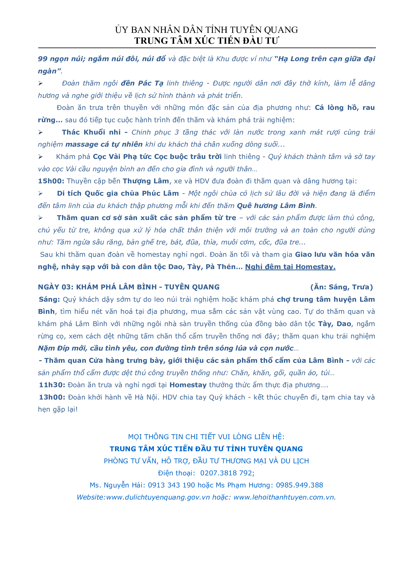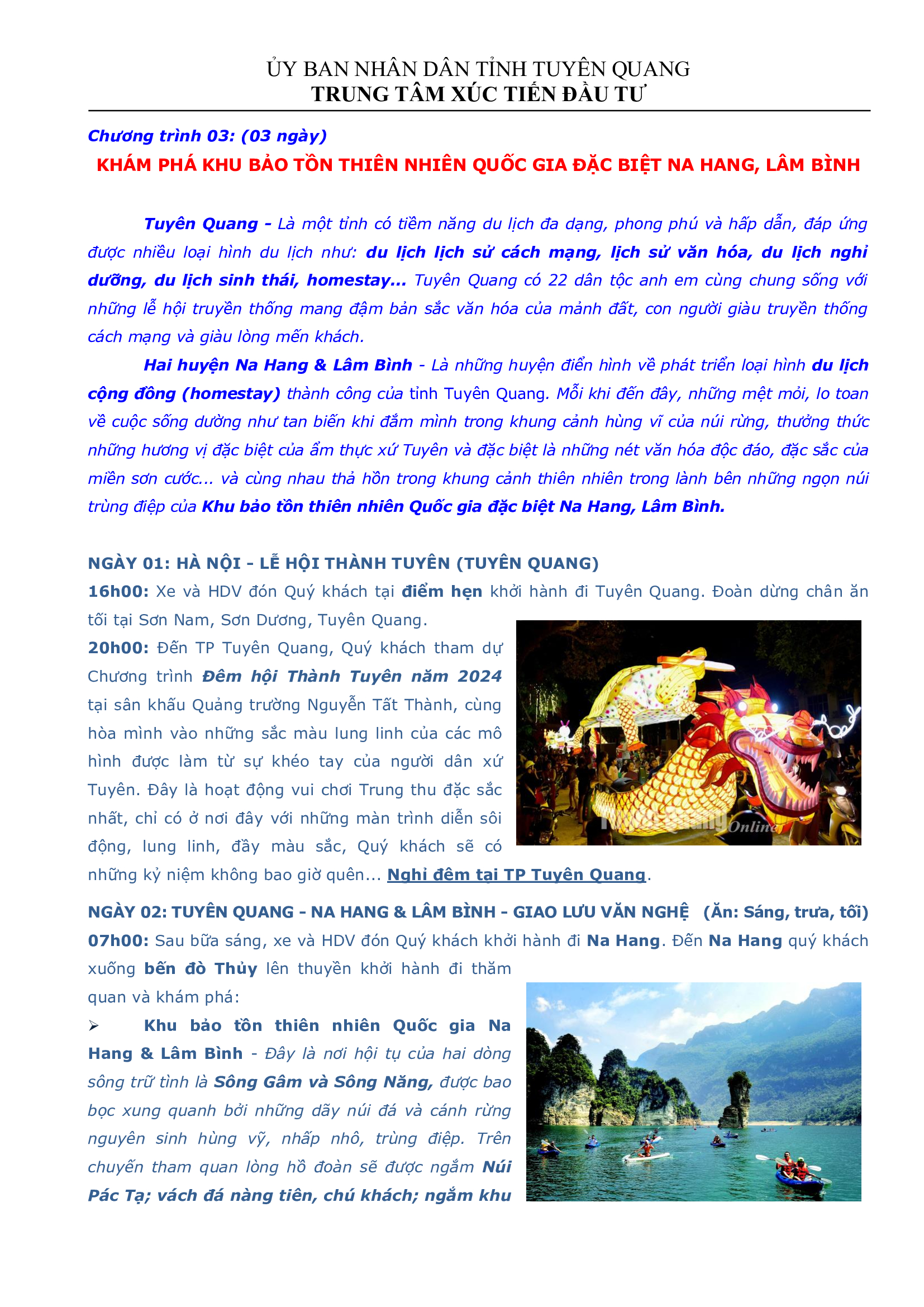 Chương trình 03: (03 ngày) KHÁM PHÁ KHU BẢO TỒN THIÊN NHIÊN QUỐC GIA ĐẶC BIỆT NA HANG, LÂM BÌNH Ngày đăng: Thứ 2, 12/8/2024 - 8:44 Lượt xem: 316 Tuyên Quang - Là một tỉnh có tiềm năng du lịch đa dạng, phong phú và hấp dẫn, đáp ứng được nhiều loại hình du lịch như: du lịch lịch sử cách mạng, lịch sử văn hóa, du lịch nghỉ dưỡng, du lịch sinh thái, homestay... Tuyên Quang có 22 dân tộc anh em cùng chung sống với những lễ hội truyền thống mang đậm bản sắc văn hóa của mảnh đất, con người giàu truyền thống cách mạng và giàu lòng mến khách. Hai huyện Na Hang & Lâm Bình - Là những huyện điển hình về phát triển loại hình du lịch cộng đồng (homestay) thành công của tỉnh Tuyên Quang. Mỗi khi đến đây, những mệt mỏi, lo toan về cuộc sống dường như tan biến khi đắm mình trong khung cảnh hùng vĩ của núi rừng, thưởng thức những hương vị đặc biệt của ẩm thực xứ Tuyên và đặc biệt là những nét văn hóa độc đáo, đặc sắc của miền sơn cước... và cùng nhau thả hồn trong khung cảnh thiên nhiên trong lành bên những ngọn núi trùng điệp của Khu bảo tồn thiên nhiên Quốc gia đặc biệt Na Hang, Lâm Bình. Bài viết liên quan Chương trình 02: 02 ngày Lung linh đêm hội Thành Tuyên Thứ 2, 12/8/2024 - 8:41 Chương trình 01: (02 ngày) Trải nghiệm làm đèn Trung thu Thứ 2, 12/8/2024 - 8:39 Tour Thác Bản Ba (huyện Chiêm Hóa) Thứ 2, 28/8/2023 - 16:29
