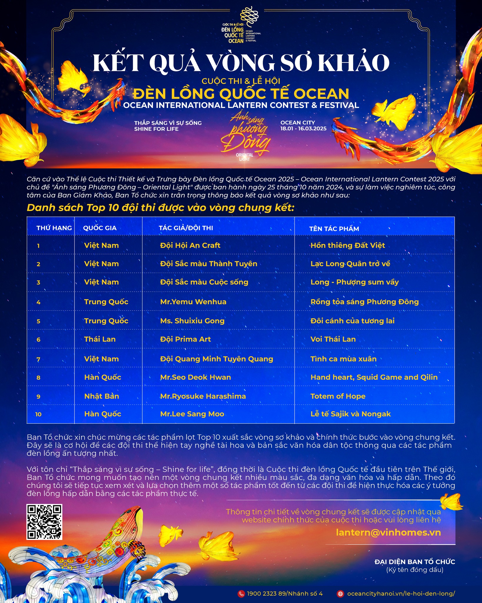 Sau vòng sơ khảo, Ban giám khảo chọn 15 tác phẩm xuất sắc tham dự vòng chung kết, diễn ra từ nay đến hết ngày 15/1/2025. Trong đó có 5 đội đại diện của tỉnh Tuyên Quang tham gia gồm: Đội Sắc màu Thành Tuyên, Sắc màu Cuộc sống, Quang Minh Tuyên Quang, Lung linh Lễ hội thành Tuyên và đội của chị Dương Thị Nga đã xuất sắc lọt vào vòng chung kết. Các thiết kế đều tập trung tôn vinh giá trị văn hóa dân tộc bằng nghệ thuật ánh sáng. Những vị thần trong truyền thuyết như Thánh Gióng, Lạc Long Quân, Chử Đồng Tử được các nghệ nhân thể hiện một cách phong phú, sống động qua các mô hình.