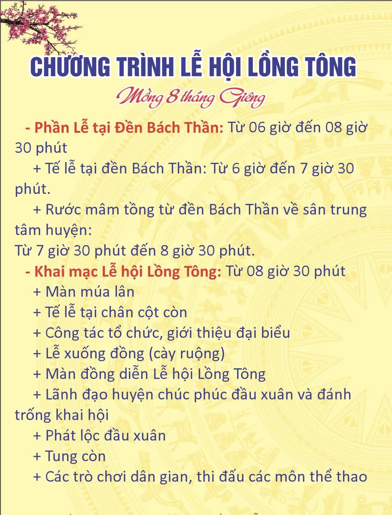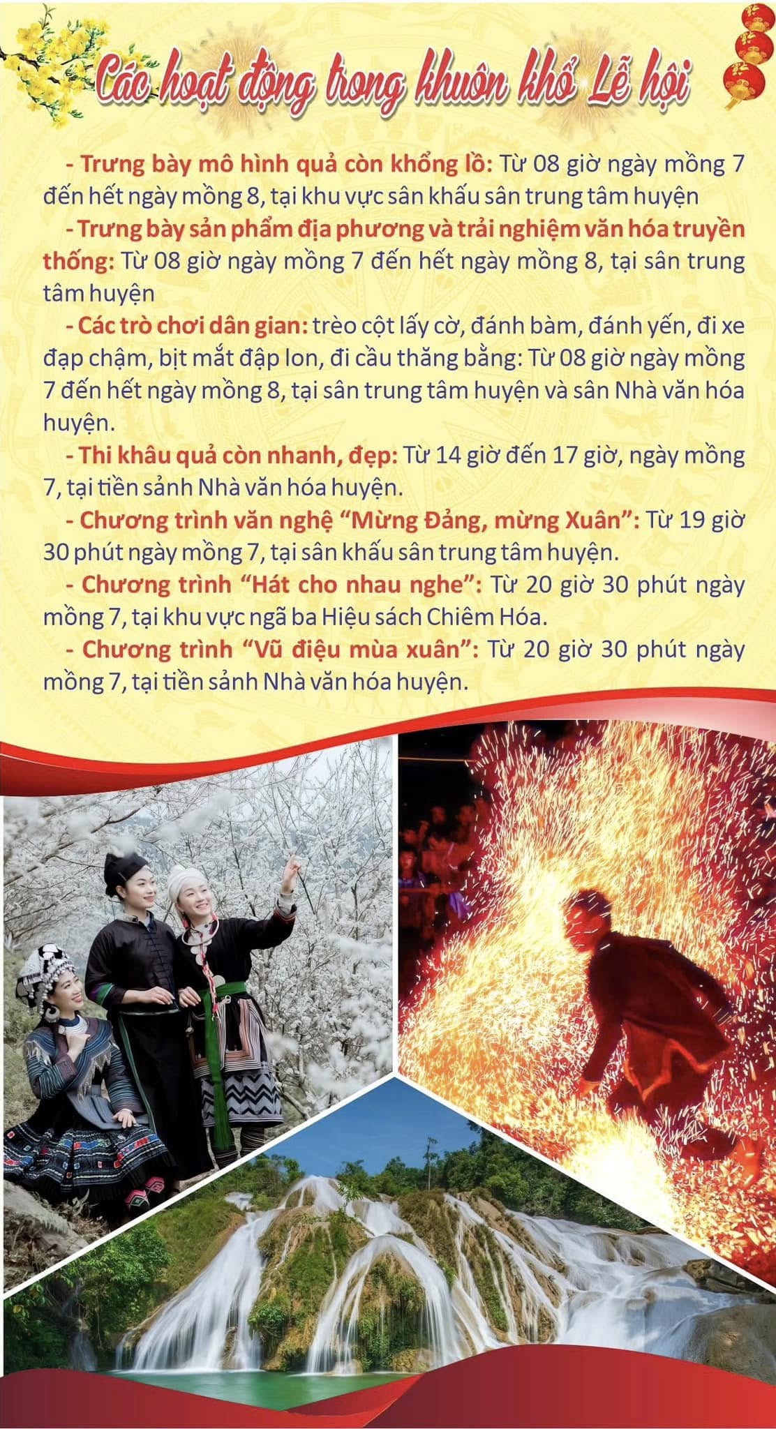 RỘN RÀNG MÙA LỄ HỘI LỒNG TÔNG - SẮC XUÂN ĐẤT CHIÊM HÓA 2025 Ngày đăng: Chủ nhật, 2/2/2025 - 11:25 Lượt xem: 197 Hãy cùng hòa mình vào bầu không khí lễ hội đầy sắc xuân, nơi tái hiện những nét đẹp truyền thống của đồng bào các dân tộc. Lễ hội Lồng Tông không chỉ là dịp cầu mùa màng bội thu, mà còn là cơ hội để chiêm ngưỡng các hoạt động văn hóa đặc sắc, từ nghi thức trang trọng đến các trò chơi dân gian, nghệ thuật dân tộc và những gian hàng ẩm thực hấp dẫn Bài viết liên quan Lễ hội Đền Hạ, Đền Thượng, Đền Ỷ La năm 2025 Thứ 2, 13/1/2025 - 9:58 HUYỆN CHIÊM HOÁ TỔ CHỨC HỘI THI ĐÁNH CÙ (TÙ LU) DÂN TỘC MÔNG LẦN THỨ NHẤT, NĂM 2024 Thứ 5, 28/11/2024 - 9:53 Tỉnh Tuyên Quang có 5 đội tham gia và xuất sắc lọt vào vòng Chung kết Lễ hội đèn lồng quốc tế năm... Thứ 6, 29/11/2024 - 15:2
