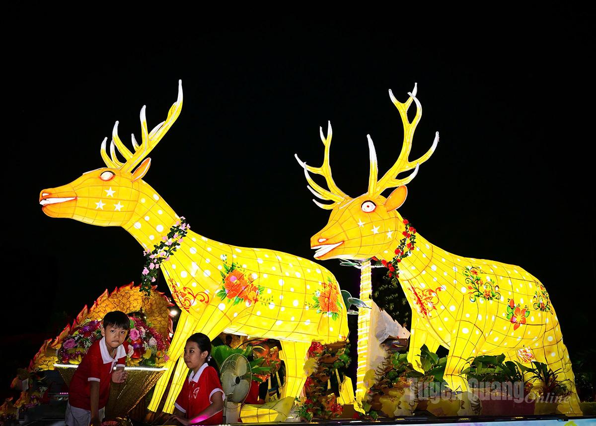 Mô hình đèn Trung thu hình đôi hươu vàng rực rỡ trong đêm hội.
