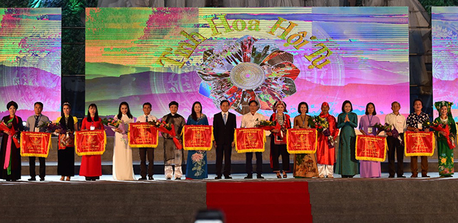 20h40: Các đồng chí lãnh đạo Bộ Văn hóa, Thể thao và Du lịch, UBND tỉnh trao hoa và cờ lưu niệm cho 11 đoàn nghệ nhân tham gia Liên hoan trình diễn di sản văn hóa phi vật thể quốc gia năm 2019.