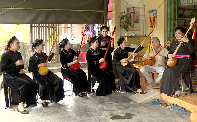 Các thành viên đội văn nghệ quần chúng xã Phúc Sơn (Chiêm Hóa) luyện tập hát Then.