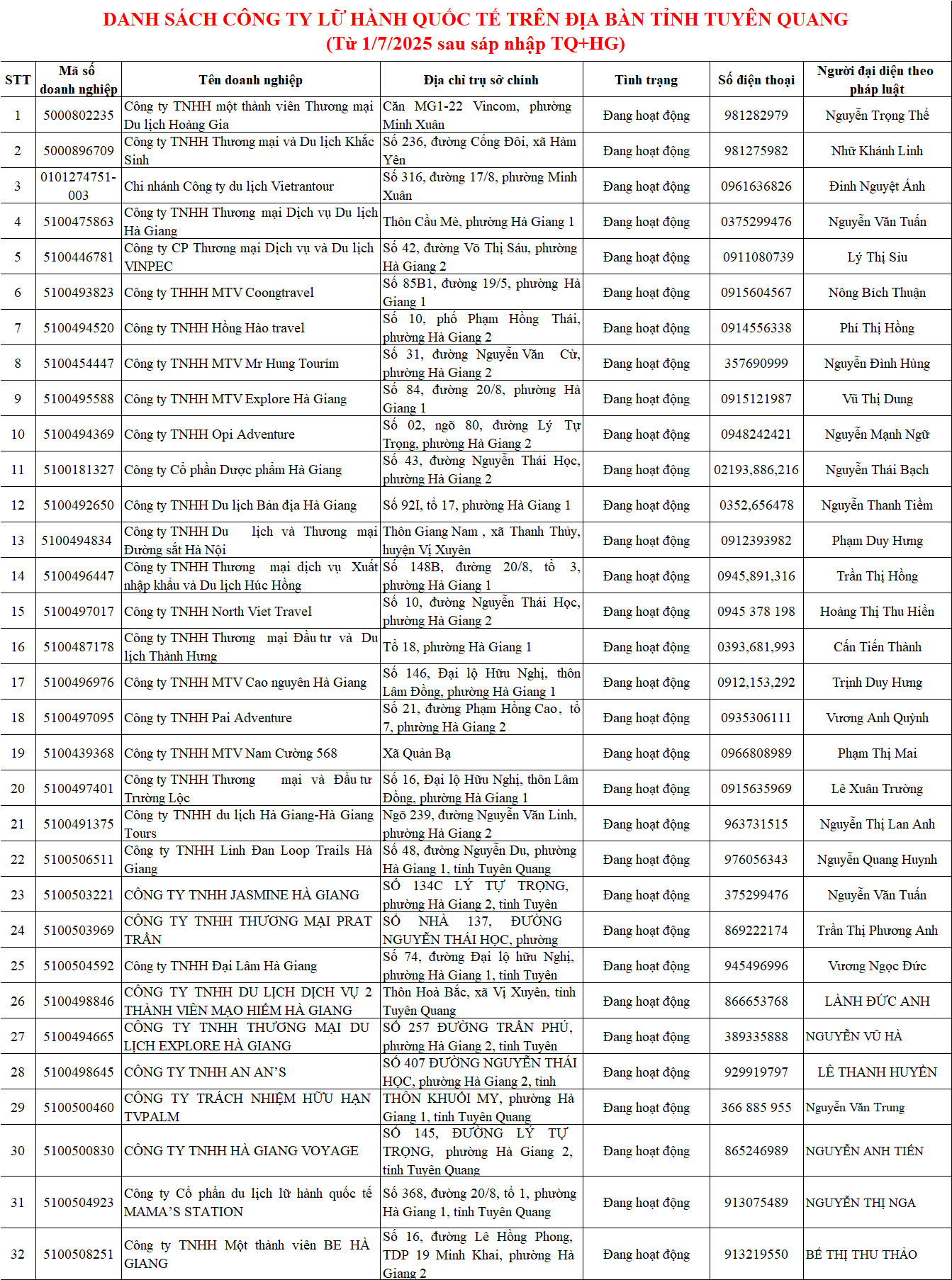 DANH SÁCH CÔNG TY LỮ HÀNH NỘI ĐỊA TRÊN ĐỊA BÀN TỈNH TUYÊN QUANG NĂM 2025 Ngày đăng: Thứ 5, 8/1/2026 - 8:20 Lượt xem: 90 DANH SÁCH CÔNG TY LỮ HÀNH NỘI ĐỊA TRÊN ĐỊA BÀN TỈNH TUYÊN QUANG Bài viết liên quan Danh sách Cơ sở lưu trú, nhà hàng, homestay tại thành phố Tuyên Quang đến tháng 12/2025 Thứ 4, 7/1/2026 - 14:44 Danh sách Cơ sở lưu trú, nhà hàng, homestay tại thành phố Tuyên Quang năm 2024 Thứ 4, 14/8/2024 - 16:27 Danh sách Cơ sở lưu trú, nhà hàng, homestay tại huyện Lâm Bình năm 2024 Thứ 4, 14/8/2024 - 16:25