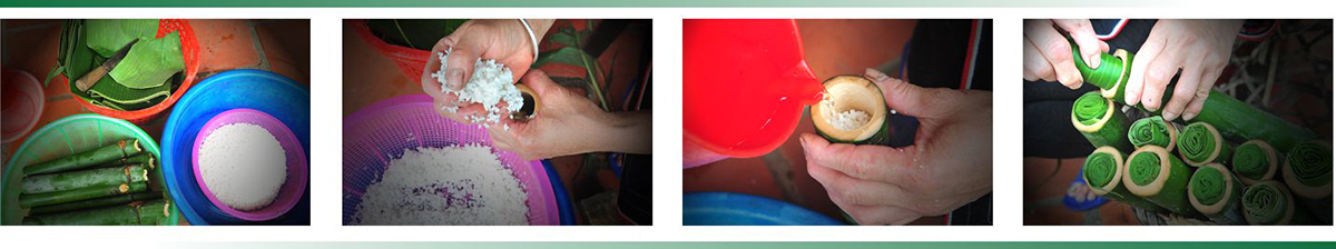 Những gióng cơm lam sau khi được rửa sạch rồi cho gạo nếp và nước ngập miệng ống. Sau đó, nút kín miệng ống bằng chuối tươi. Nút lá chuối được lấy từ cây chuối rừng để cho cơm lam được thơm hơn.
