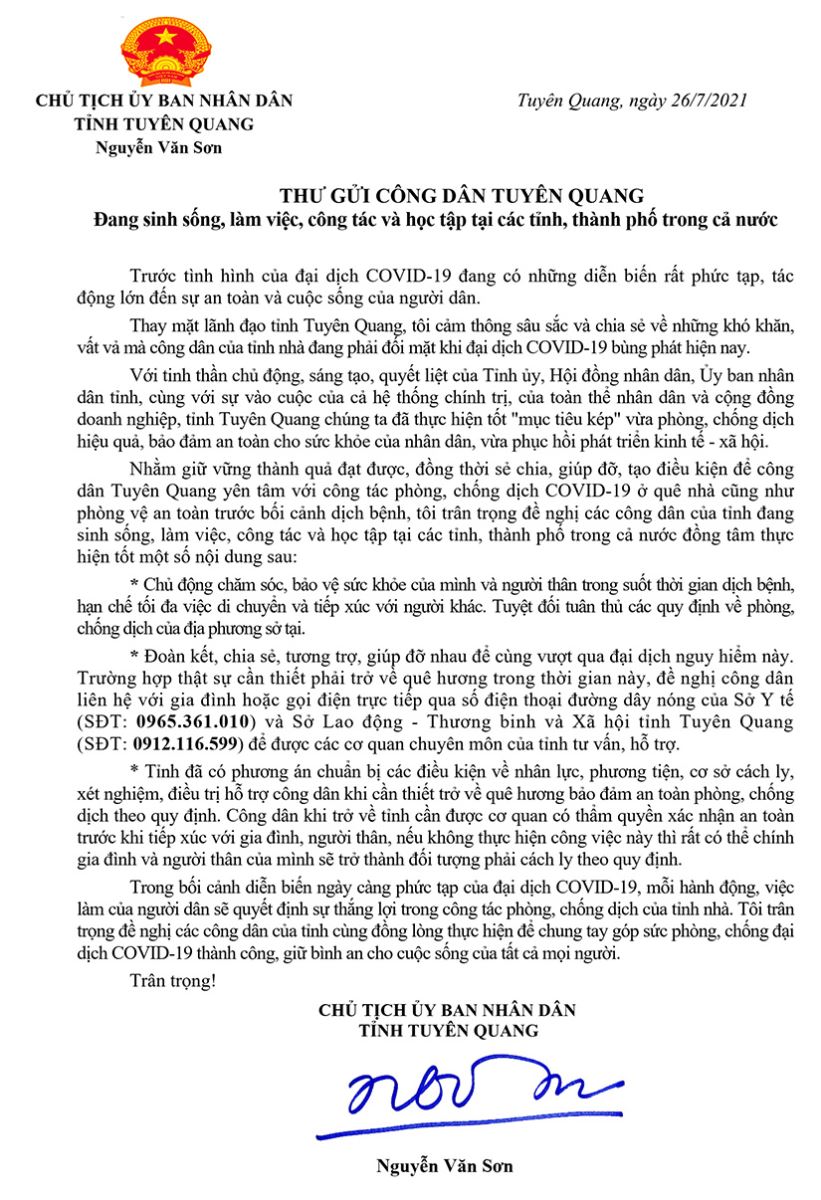 Trong thư nhấn mạnh, trước tình hình đại dịch Covid-19 đang có những diễn biến rất phức tạp, tác động lớn đến sự an toàn và cuộc sống của người dân, thay mặt lãnh đạo tỉnh Tuyên Quang, đồng chí cảm thông sâu sắc và chia sẻ về những khó khăn, vất vả mà công dân của tỉnh đang phải đối mặt với đại dịch Covid-19 bùng phát hiện nay. Với tinh thần chủ động, sáng tạo, quyết liệt của Tỉnh ủy, HĐND, UBND tỉnh, cùng với sự vào cuộc của cả hệ thống chính trị, của toàn thể nhân dân và cộng đồng doanh nghiệp, tỉnh Tuyên Quang đã thực hiện tốt “mục tiêu kép” vừa phòng, chống dịch hiệu quả, bảo đảm an toàn sức khỏe của nhân dân, vừa phục hồi phát triển kinh tế - xã hội.