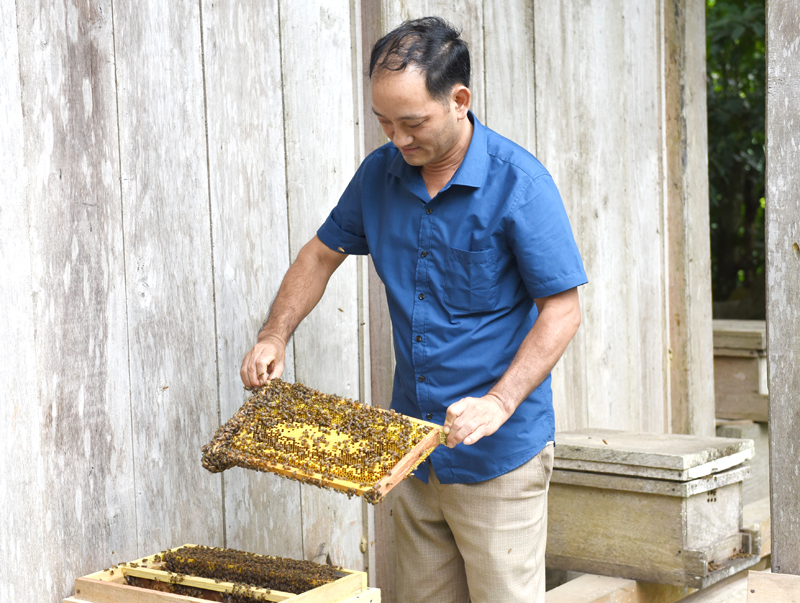 Anh Phùng Thanh Tiến, thôn Nà Mu, xã Sơn Phú (Na Hang) kiểm tra đàn ong của gia đình.