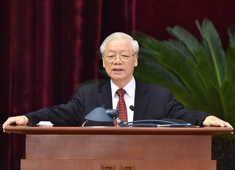 Tổng Bí thư Nguyễn Phú Trọng phát biểu tại Hội nghị Trung ương 4 (khóa XIII) - Ảnh: Phạm Cường